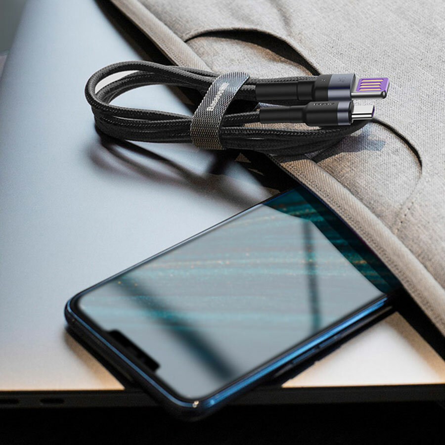 Быстрый, удобный и надежный кабель Baseus Cafule Quick Charging CATKLF-PG1 предназначен для зарядки и синхронизации с компьютером гаджетов, оснащенных разъемом USB Type-C. Поддерживает два стандарта быстрой зарядки с максимальной мощностью до 40 Вт: Super Charge для Huawei и Quick Charge 3.0. В комплекте к нему идет ремешок на липучке для компактного хранения. На одном конце кабеля коннектор USB Type-C, а на другом – двусторонний USB, который вставляется в порт любой стороной.