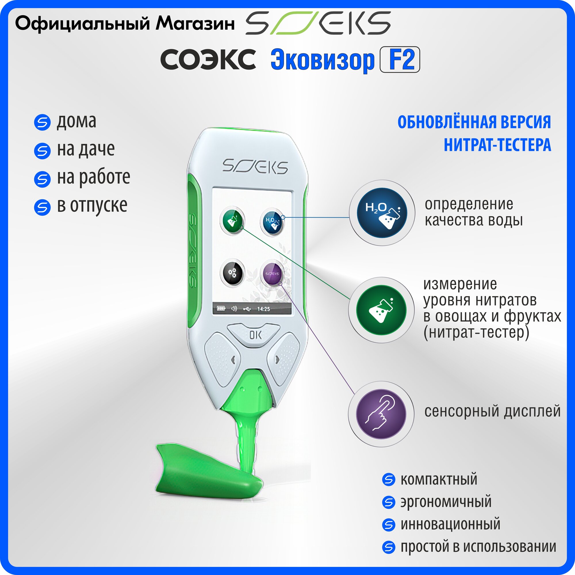 Нитрат-тестер СОЭКС Эковизор (нитрат-тестер, оценка качества воды).Компактный и простой в использовании прибор для определения качества пищевых продуктов и воды. При снятии колпачка прибор автоматически переходит в режим измерения нитратов. Выбор продуктов для анализа расширен.Все нормы по содержанию нитратов уже внесены в память Эковизора .Корпус выполнен из материала софтач-пластика и прорезиненными боковыми элементами. Сенсорный экран значительно упрощает управление и делает интерфейс более наглядным. Прибор можно подключить к компьютеру, что позволяет легко обновить прошивку. Композитный зонд позволяет измерять в нескольких точках одновременно и показывать точные измерения при любой температуре продукта. Прибор способен определить жёсткость водопроводной воды, проверить работоспособность фильтра и качество воды из скважины.В экспресс-анализаторе установлены аккумуляторы, а в комплекте поставляется шнур для подключения к компьютеру и фирменное зарядное устройство.Особенности:Измерение уровня нитратов в овощах и фруктах (нитрат-тестер).Определение качества воды.Cенсорный дисплей.Расширенный список продуктов.Композитный зонд.Подключение к компьютеру.