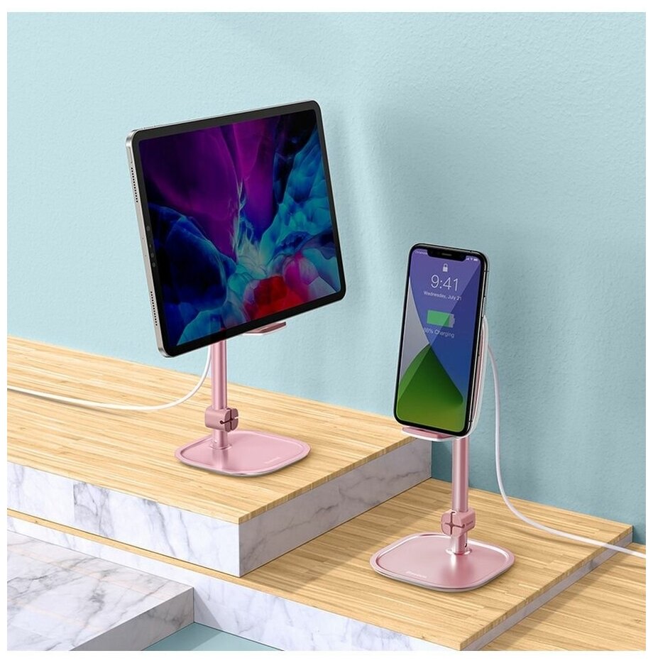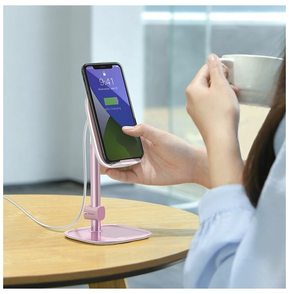 Держатель Baseus выполнен из прочного алюминия, а устойчивость конструкции обеспечена широкой платформой, которая также служит для хранения различных аксессуаров. В днище держателя использованы резиновые накладки, благодаря чему он не оставляет следов на покрытии стола или тумбы.