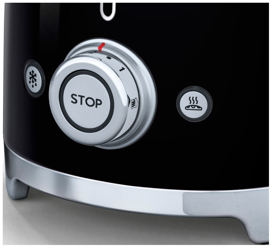Яркий тостер на два ломтика Smeg из коллекции «стиль 50-х годов» дополнит интерьер кухни. Функция «багель» подрумянивает одну сторону булочки, а функция «размораживание» предназначена для поджаривания замороженного хлеба. С помощью круглой ручки можно выбрать один из 6 уровней мощности. Во время активации функций подсвечиваются соответствующие кнопки. При необходимости можно уложить провод под основанием тостера.