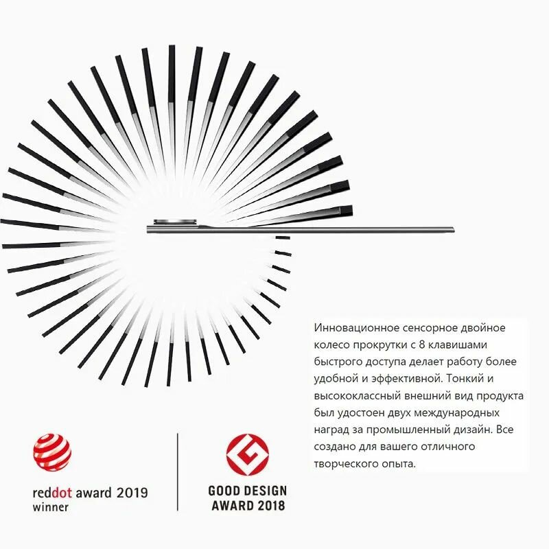 XP-Pen Deco M обладает продуманной конструкцией, которая позволяет удобно рисовать как правой, так и левой рукой. Толщина модели составляет всего 7 мм, а для быстрого доступа к различным функциям предусмотрено двойное кольцо и 8 клавиш. Для подключения к устройствам используется интерфейс USB-C.