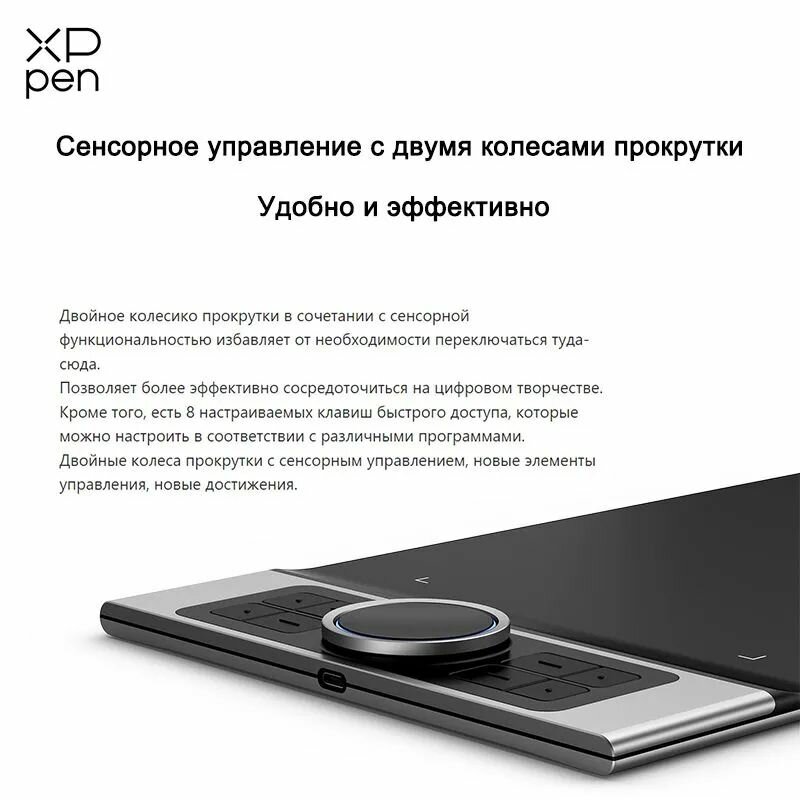 XP-Pen Deco M представляет собой функциональный и удобный графический планшет, рабочая область которого составляет 11 х 6 дюймов. Модель обладает уникальным двойным кольцом регулировки, внешняя часть которого физическая, а внутренняя - виртуальная (сенсорная панель).