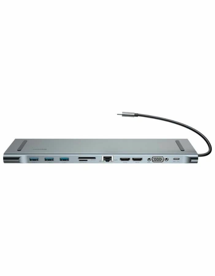 Baseus представляет собой USB-концентратор с подключением USB Type C и широким набором интерфейсов. Заняв всего один порт на вашем ноутбуке данный хаб добавляет еще 11 интерфейсов, среди которых три порта USB-A с поддержкой стандарта 3.0, картридер для карт памяти SD и microSD, видеовыходы для аналоговой и цифровой техники (HDMI и VGA), аудиовыход на наушники, а также разъем RJ-45 для подключения к локальной сети и сквозной порт USB-C.