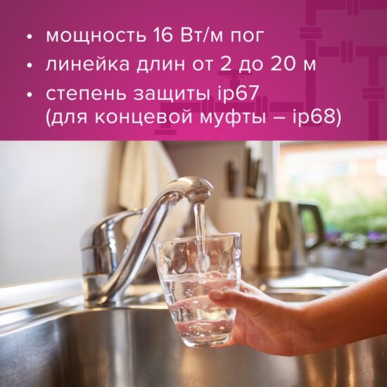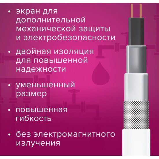 - Рекомендован для внутреннего обогрева трубопроводов с питьевой водой, а также для водопроводных и канализационных труб.