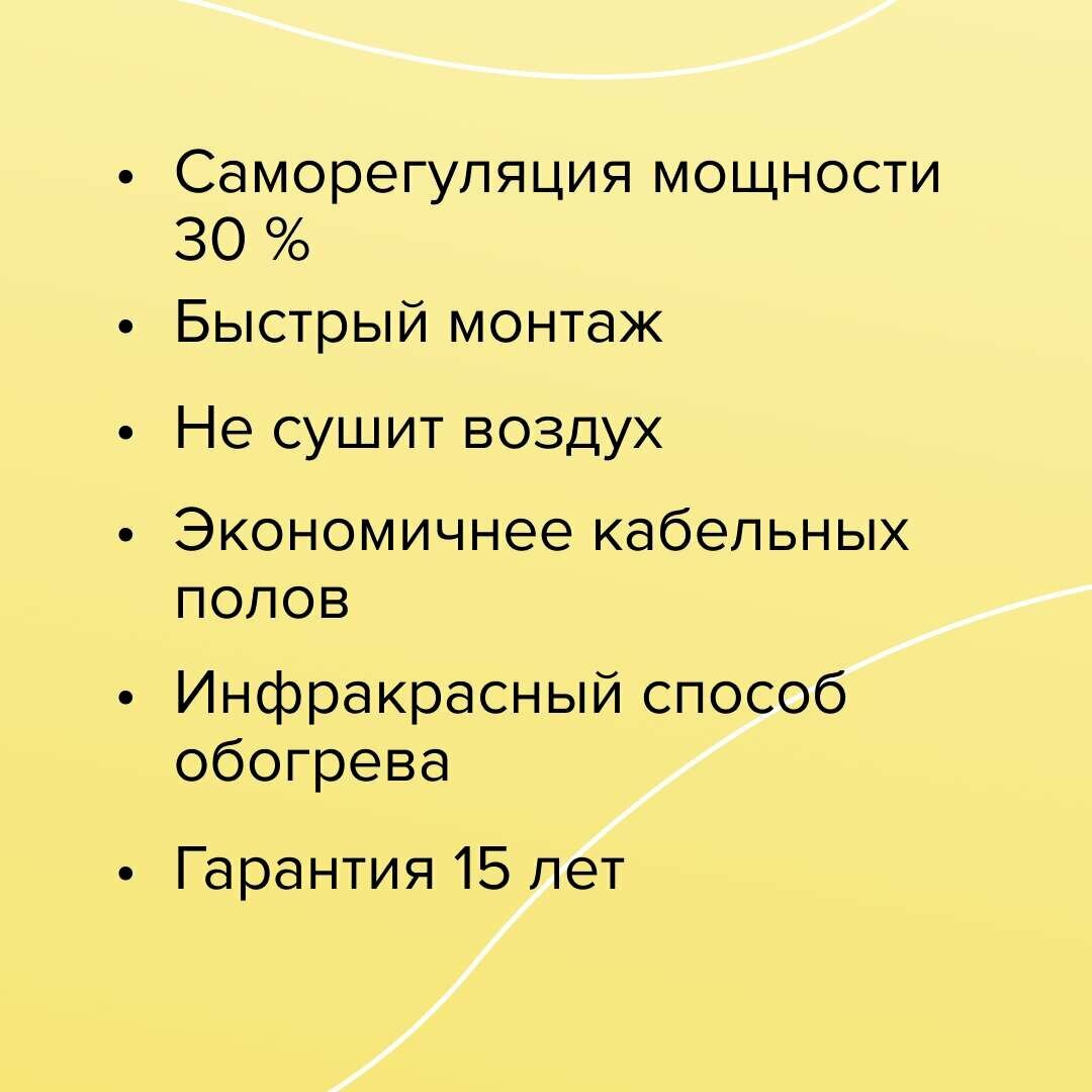 - Обладает эффектом саморегуляции: при увеличении температуры пола потребляемая мощность снижается в 1,5 1,8 раза.
