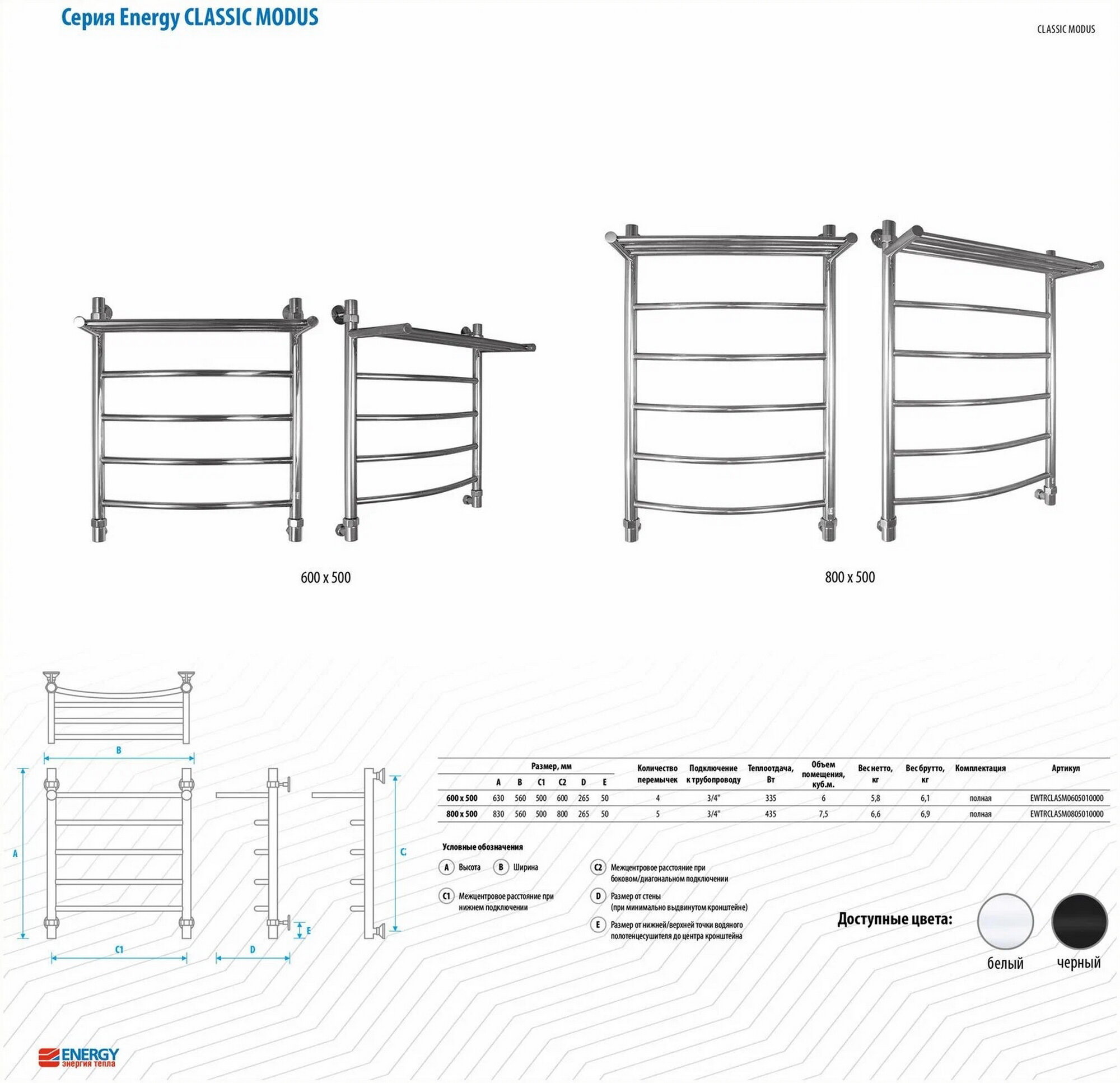 Полотенцесушители Energy Classic Modus типа «лесенка + полка». Теперь на них можно сушить не только полотенца или текстиль, но и обувь и головные уборы. Кроме того, полочка увеличивает теплоотдачу, что делает радиатор более мощным, при этом он не занимает много места. Полотенцесушители этой серии выполнены из нержавеющей стали марки AISI 304 (08и18Н10).