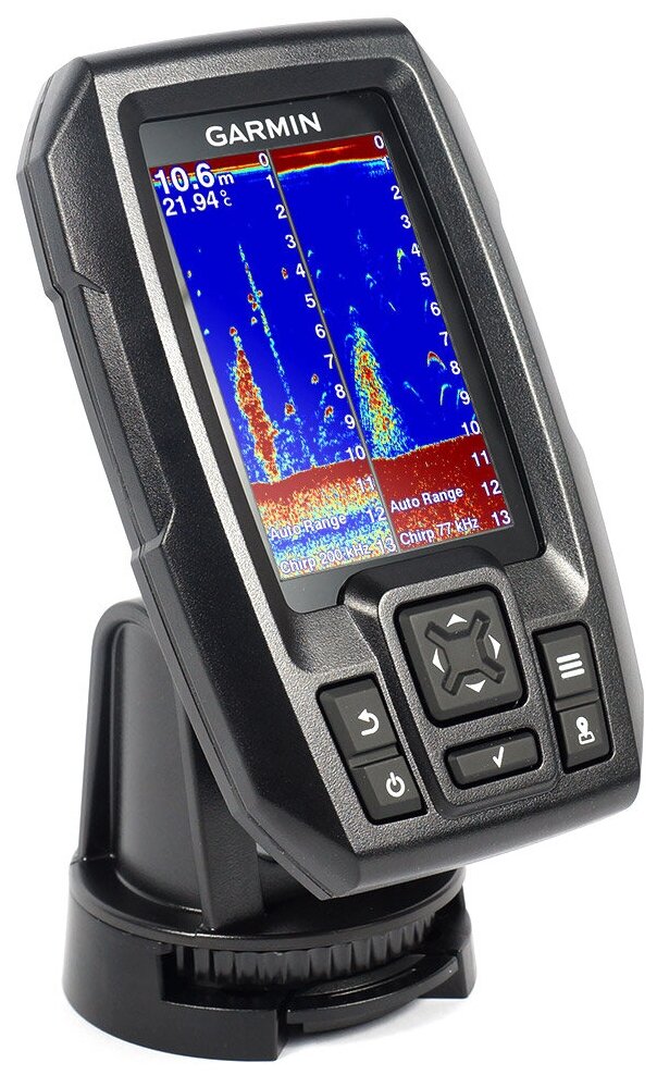 Эхолот Garmin Striker 4 снабжён высокоэффективным сканером CHIRP. В отличие от традиционных приспособлений, он генерирует сигналы нескольких частот, что позволяет получить при расшифровке чёткие арки, означающие присутствие рыбы.