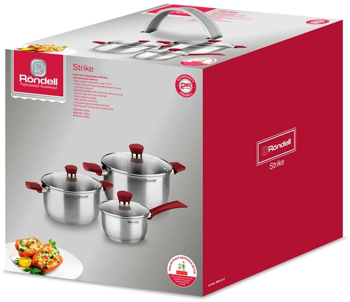 Набор посуды Rondell 817 Набор 6 предметов (кастрюли 18, 20, ковш 14) Strike Rondell (ST) Одно из ключевых преимуществ коллекции, которое оценит каждый кулинар — уникальное сочетание функциональности, элегантного дизайна и выгодной цены. Коллекция посуды Strike позволит Вам легко воплощать в жизнь любимые блюда благодаря ковшам: 14 см (0.9 л), 16 см (1.3л) и кастрюлям: 18 см (2.0 л), 20 см (2.8 л) и 24 см (4.8л) оптимального объема и диаметра. Посуду Вы можете приобрести как отдельно, так и в наборах из 4-х, 6-ти и 8-ми предметов. Все предметы посуды коллекции оснащены крышками из жаропрочного стекла толщиной 4 мм. Благодаря отверстию для паровыпуска Вы можете контролировать процесс приготовления блюда без потери тепла. Особое удобство в обращении с кастрюлями и ковшом обеспечивают дизайнерские бакелитовые ручки с мягким силиконовым напылением благородного красного/серого цвета. Изысканные цвета напыления ручек придают предметам посуды коллекции еще больше элегантности. Благодаря клепкам ручки надежно крепятся к корпусу кастрюль или ковша, гарантируя долгий срок службы посуды. Одновременно с этим такие ручки обеспечивают не только удобное, но и безопасное использование: они не нагреваются и не скользят. Входящие в коллекцию кастрюли и ковши с крышкой позволят легко варить, тушить, томить и даже поджаривать ингредиенты блюд. Каждый предмет посуды Strike выполнен из высококачественной нержавеющей стали. Один из самых экологичных и гигиеничных, данный материал не вступает в реакцию со щелочами и кислотами, которые содержатся в продуктах, благодаря чему в блюде сохраняются все витамины и микроэлементы. Одновременно с этим сталь обладает высокой прочностью и надежностью: Вы можете забыть о деформации посуды или сколах на ней. Коллекция надолго сохранит свой эстетичный внешний вид и прослужит Вам многие годы. Среди преимуществ данной коллекции стоит выделить наличие тройного вштампованного вплавленного дна, обладающего большой теплопроводностью. Теперь готовить блюда Вы можете гораздо быстрее и эффективнее. Одновременно с этим такая технология позволяет теплу равномерно распределяться и сохраняться не только по дну, но и по всему корпусу посуды: Ваши блюда не пригорят и сохранят все свои вкусовые и питательные свойства. Наличие внутренних отметок литража позволит легко соблюдать пропорции рецептуры во время приготовления блюда. Готовить любимые блюда в данной посуде Вы можете на всех видах плит, даже индукционных.