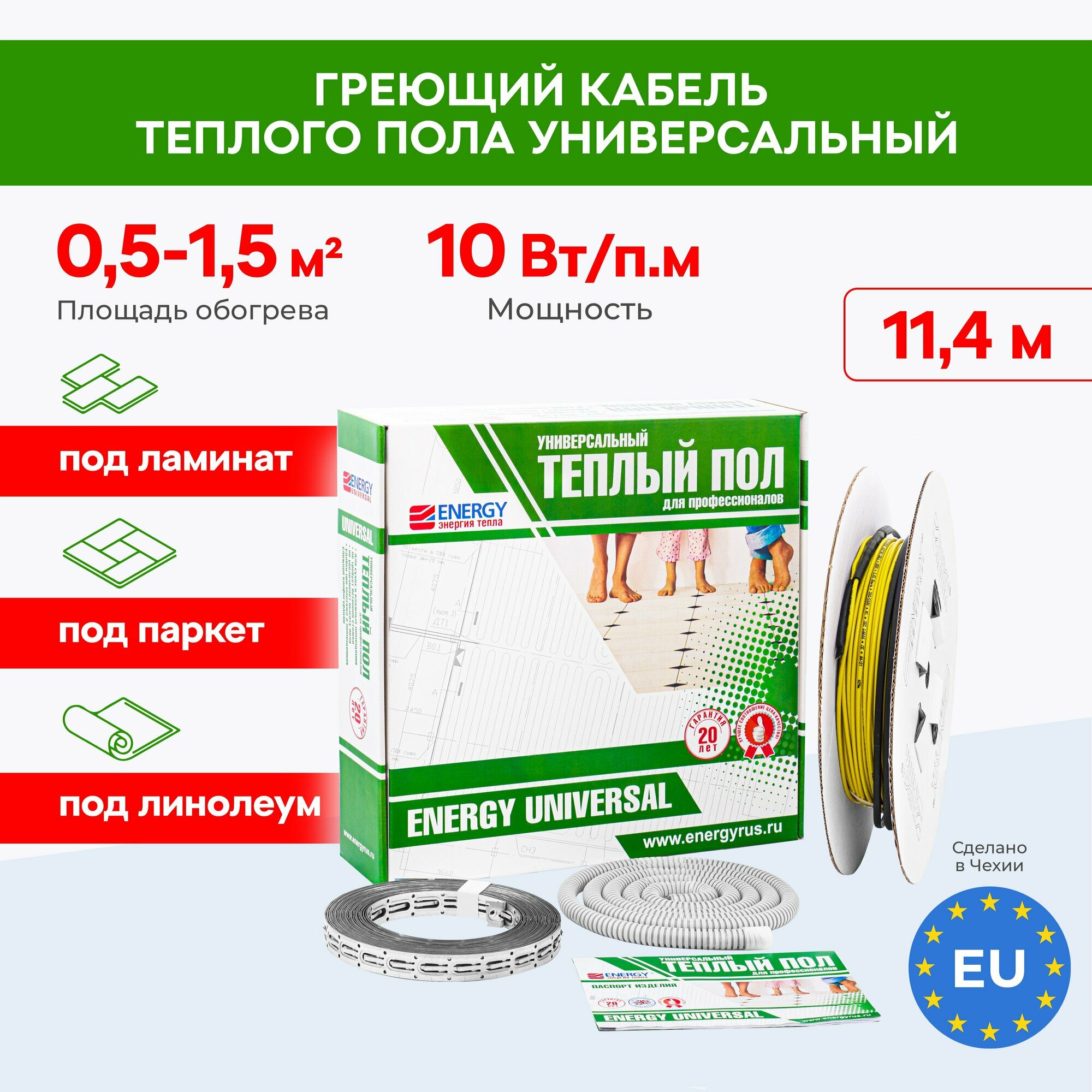 - Комплектация изделия: Нагревательный кабель Energy Universal на катушке, монтажная металлическая лента, гофрированная трубка для датчика температуры, упаковка, паспорт изделия, инструкция по установке.