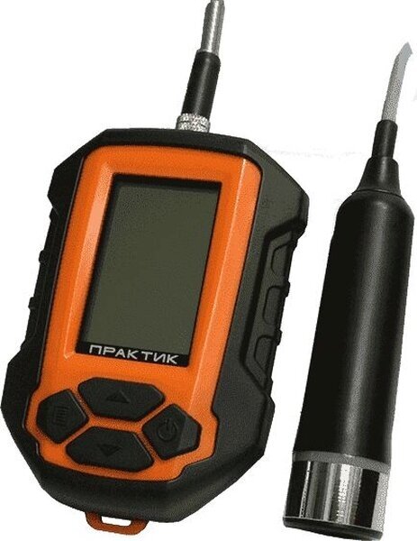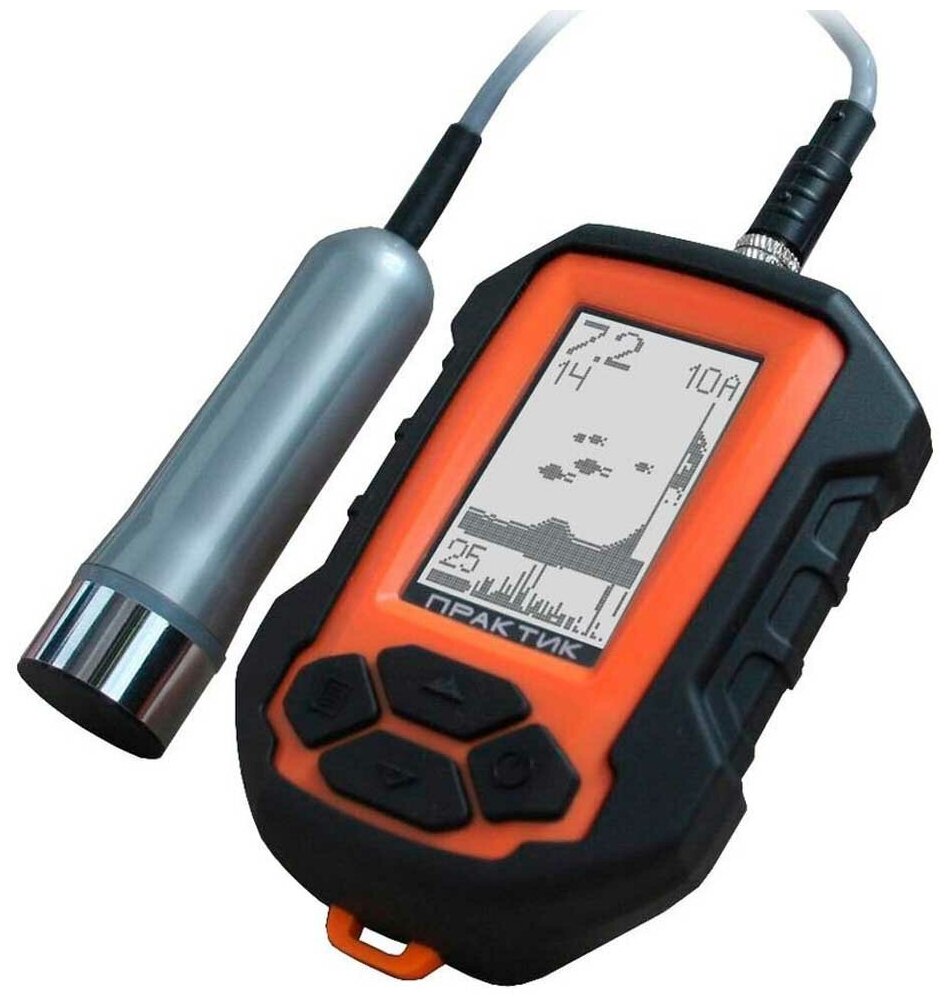 Эхолот Практик получил удобный прорезиненный корпус с яркими оранжевыми вставками, обновленный интерфейс с четырьмя кнопками управления и композитный морозостойкий датчик с усиленным кабелем.