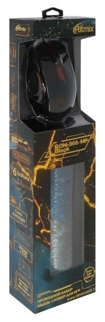 Агрессивный дизайн Ritmix ROM-366MP выделяется на фоне других игровых мышей. Ты сразу поймёшь, что в твоих руках оказалось смертоносное оружие, способное посеять ужас в сердцах врагов и хаос на поле боя.просто космосRitmix ROM-366MP привлекает к себе внимание яркими узорами и заострёнными формами корпуса. Модель оснащена подсветкой и легко подключается к компьютеру при помощи USB-кабеля. При этом контроллером могут запросто пользоваться как правши, так и левши.впечатляющая функциональностьНа мыши расположено сразу шесть кнопок, чтобы ты мог спокойно проводить время в MMORPG, стратегиях и шутерах, где важно быстро прожимать целые комбинации. Ritmix ROM-370 обладает чувствительным оптическим датчиком с разрешением, которое варьируется в диапазоне от 800 до 2400 DPI – подбери оптимальный вариант под разные игры и меняй настройки в любой удобный момент.