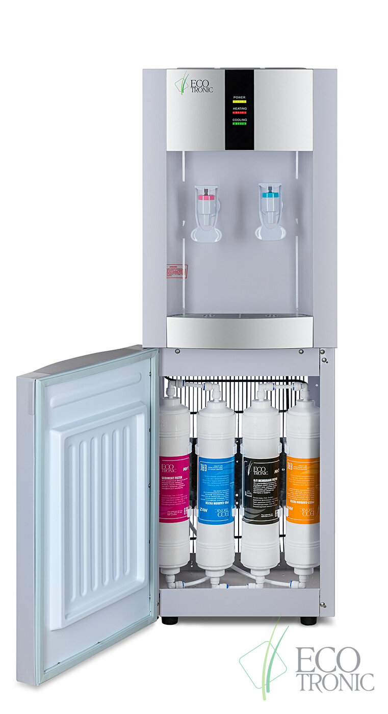 Карбо-пурифайер Ecotronic H1-U4L White (с ультрафильтрацией) очистит, охладит или нагреет воду, сделав ее пригодной к употреблению в пищу. Классические представители кулеров функционально и технически проигрывают рассматриваемой модели, хоть и цена немного выше, но техника быстро окупается. Благодаря использованию новых технологий, качественного исходного материала и экономному потреблению электроэнергии прибор стал практически универсальным в эксплуатации.