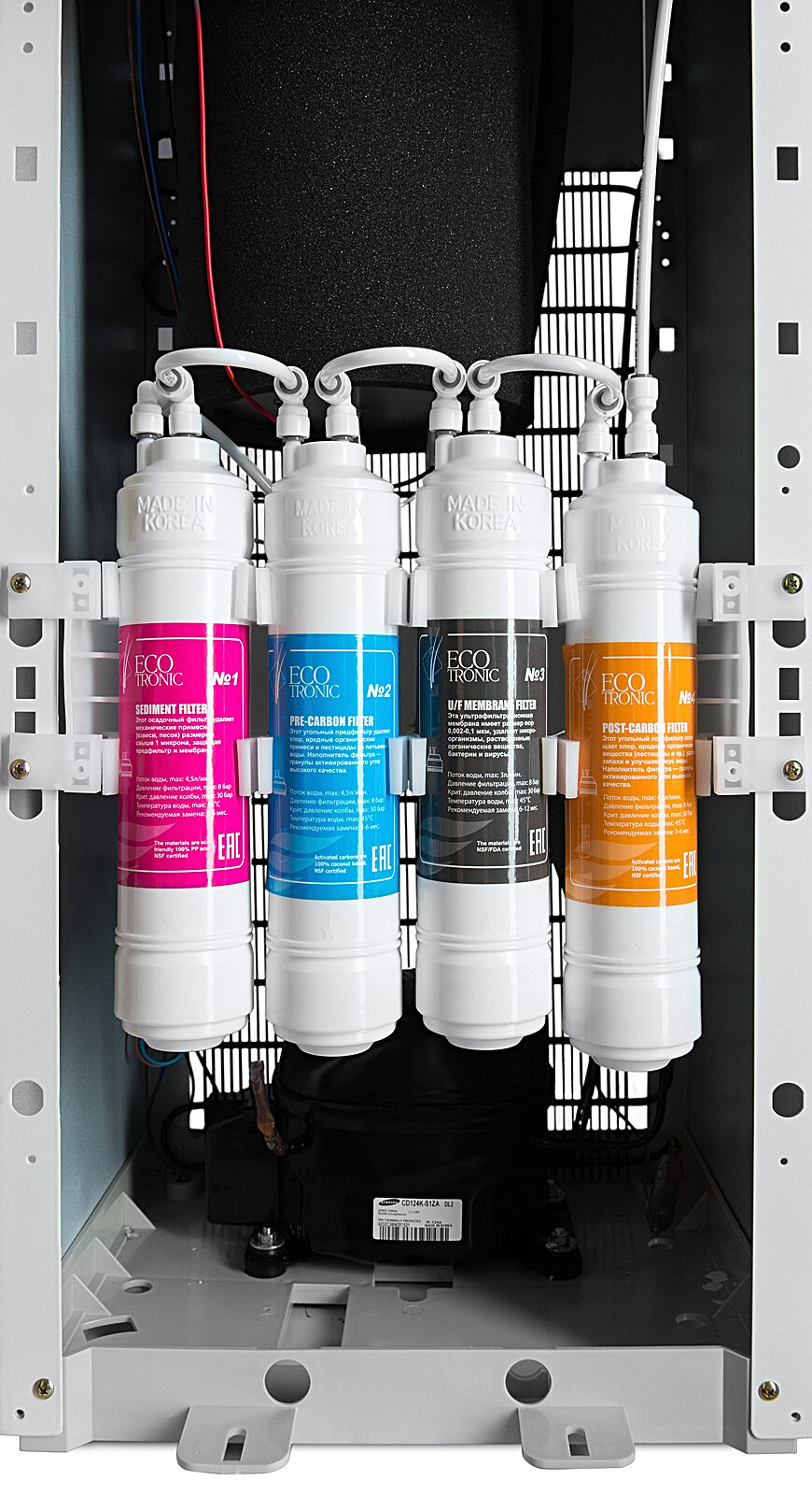 Пурифайеры компании Ecotronic обеспечивают потребителя качественной свежей водой как холодной, так и горячей с рядом дополнительных возможностей для каждой модели. Так некоторые модели дополнительно укомплектованы УФ лампой, производящей обеззараживание поступающей воды, в то же время ее можно установить и в другие аппараты. Особое место занимает фильтрация воды перед ее приготовлением, при которой вода очищается от крупных, мелких и вредных частиц различного происхождения.