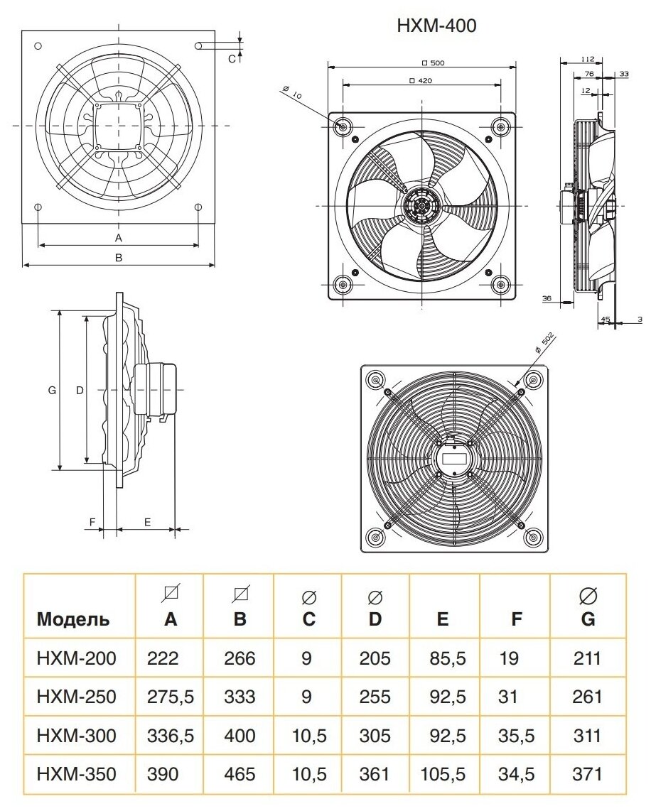 - Модель HXM-400: класс защиты IP44, класс изоляции F, с шариковыми подшипниками, встроенной термозащитой и клеммной коробкой.