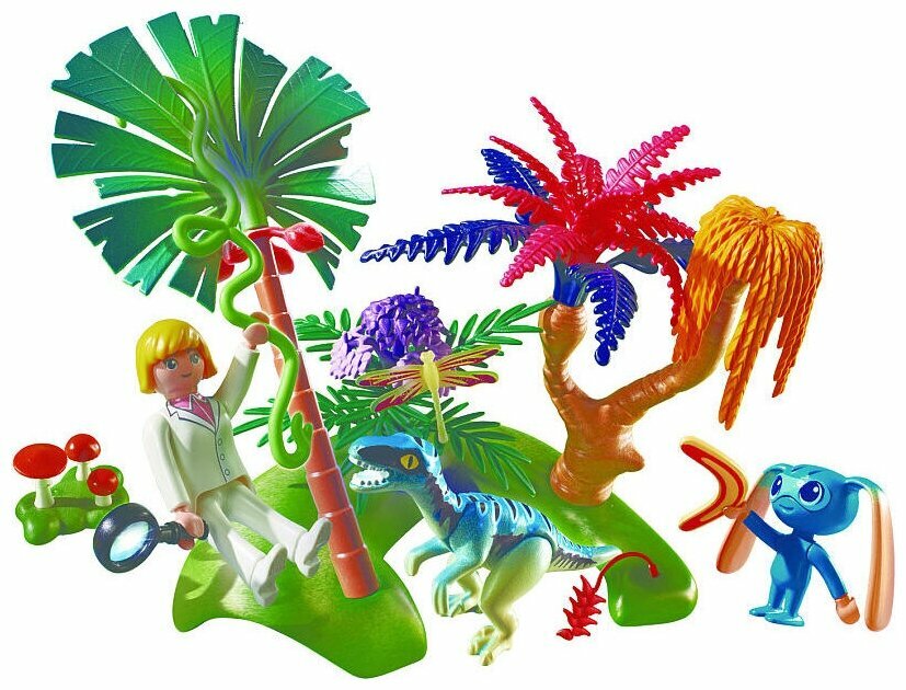 Игровой набор от Playmobil представляет собой набор из пластиковых фигурок животных, растений и фигурки ученого. Таинственное существо Алиен с гибкими ушами, динозавр, змея, необычные деревья и растения острова - все это исследует ученый из мира Технополис. Игра увлекательная и познавательная, расширяет кругозор и фантазию ребенка.