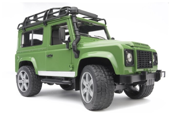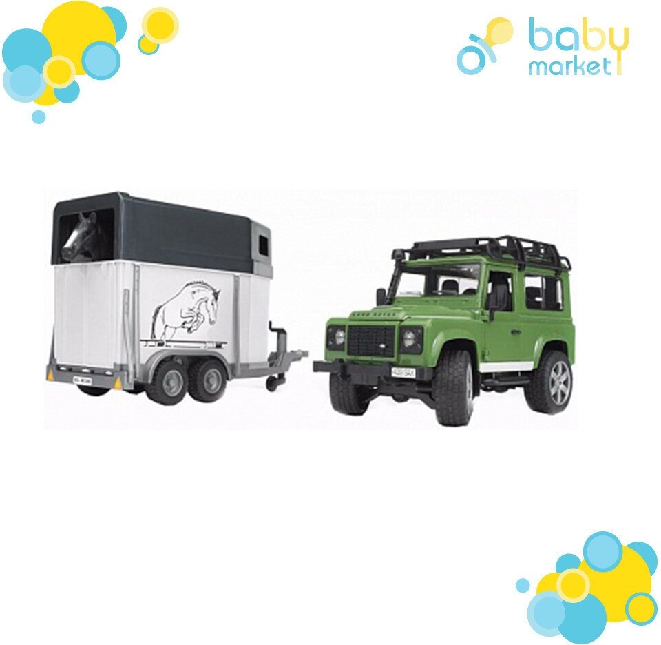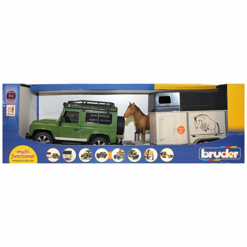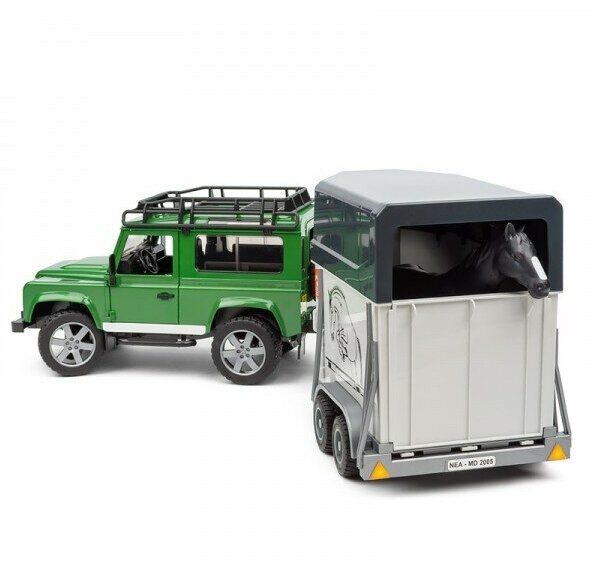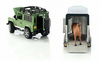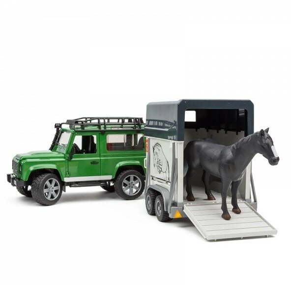 - Bruder Внедорожник Land Rover Defender с прицепом-коневозкой и лошадью