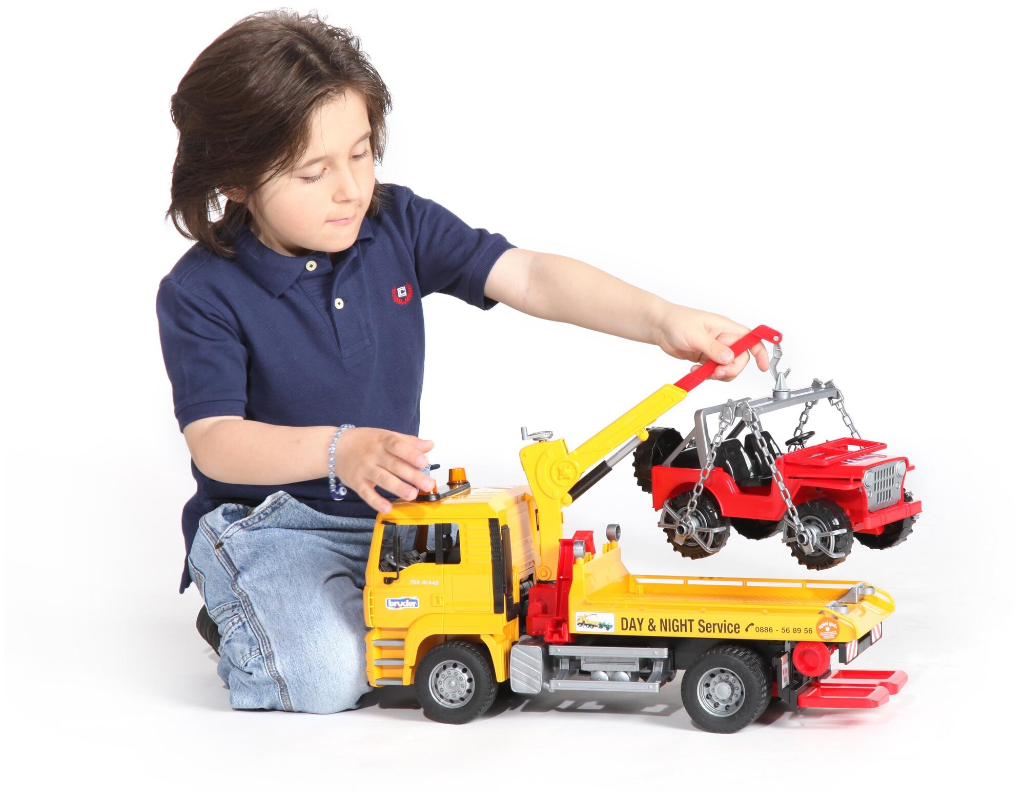 Купил сыну эвакуатор BRUDER 1:16 MAN и все прошлые выгодные проигрался сам. В наборе шел сам эвакуатор, погрузчик и машина. Абсолютно каждая часть идентичная настоящей, только в меньшем размере. Можно и за строением понаблюдать, чтоб понять где какая деталь и смоделировать процесс погрузки джипа на эвакуатор.