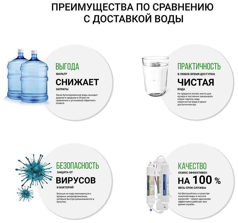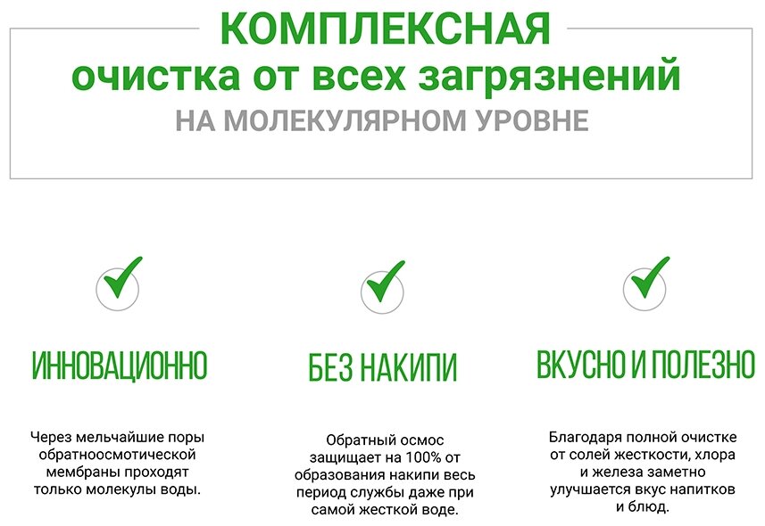 - - Низкая цена (мне обошелся в 3700, версия БЕЗ накопительного бака) - Компактная и продуманная конструкция, всего 2 модуля (низкие затраты на расходники и эксплуатацию, порядка 1-2 тысяч в ГОД) - Гарантия 3 года - Инструкция по установке полностью соответ