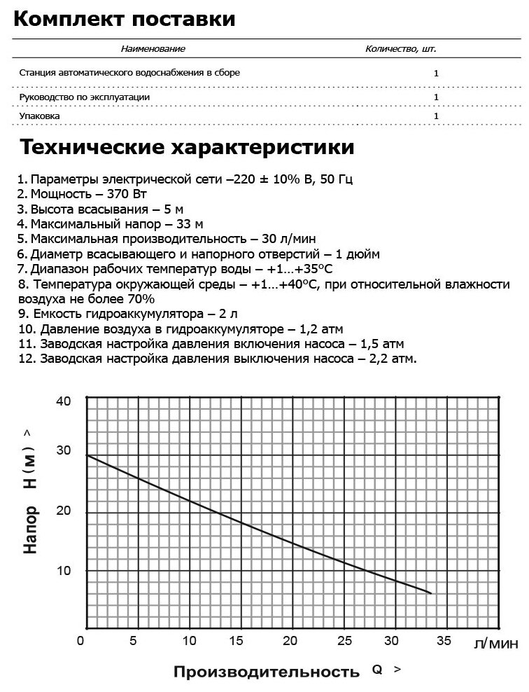 | Max напор, м | 33 |