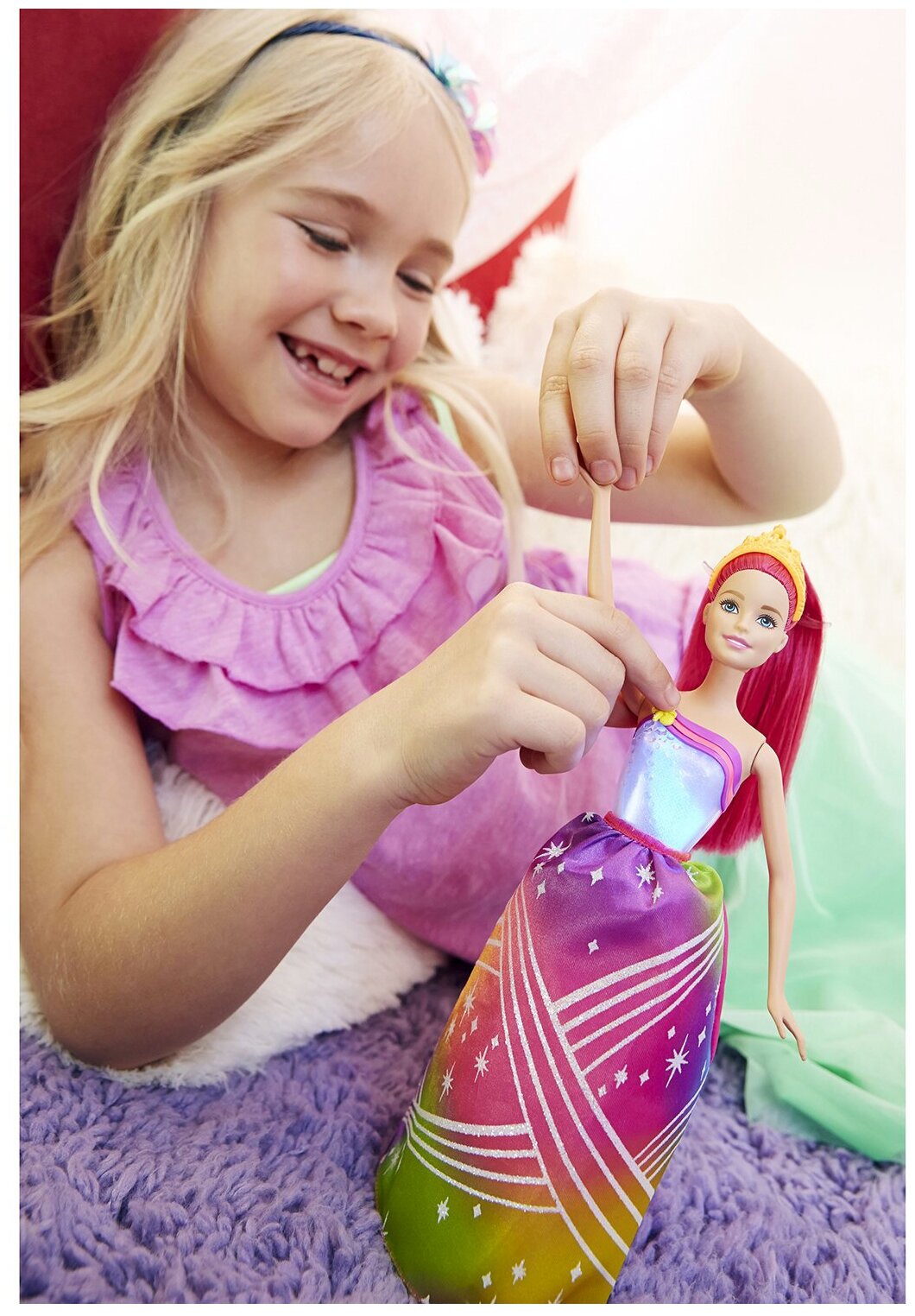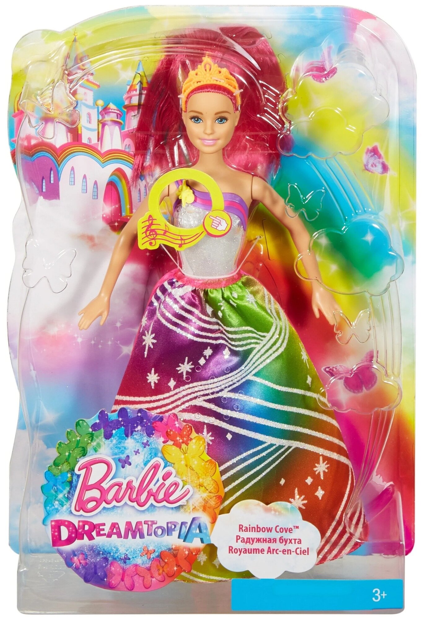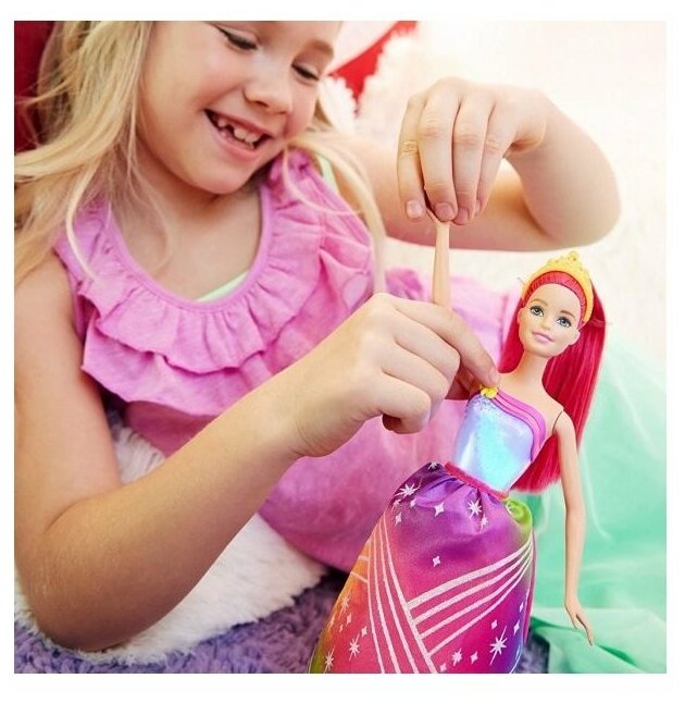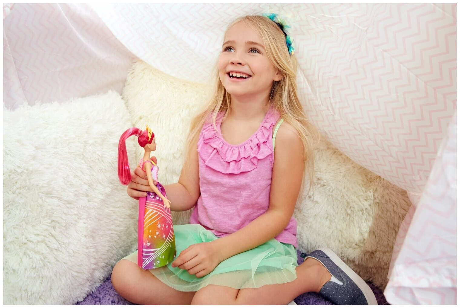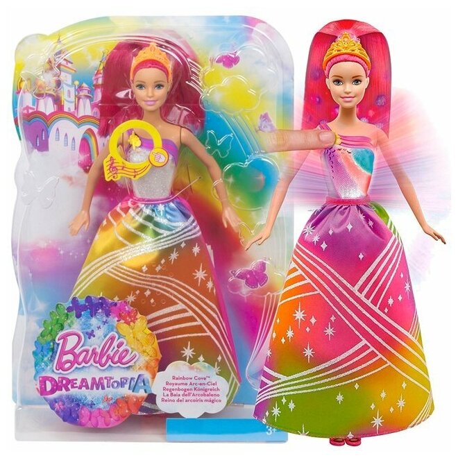 Нажмите на радужную бусину на корсаже радужной принцессы - и начнутся чудеса! Можно выбрать целых семь сочетаний музыки с подсветкой, каждое для особого случая. Такое волшебство никогда не наскучит. Яркие, радужные оттенки подсвечивают платье куклы и ее длинные и красивые волосы. Эта волшебная принцесса - героиня множества сказок, и она может раскрасить ваш день своей чудесной световой магией. Куклы, пожалуй, самые популярные игрушки в мире. Девочки обожают играть с ними, отправляясь в сказочную страну грез. Порадуйте свою малышку таким великолепным подарком!