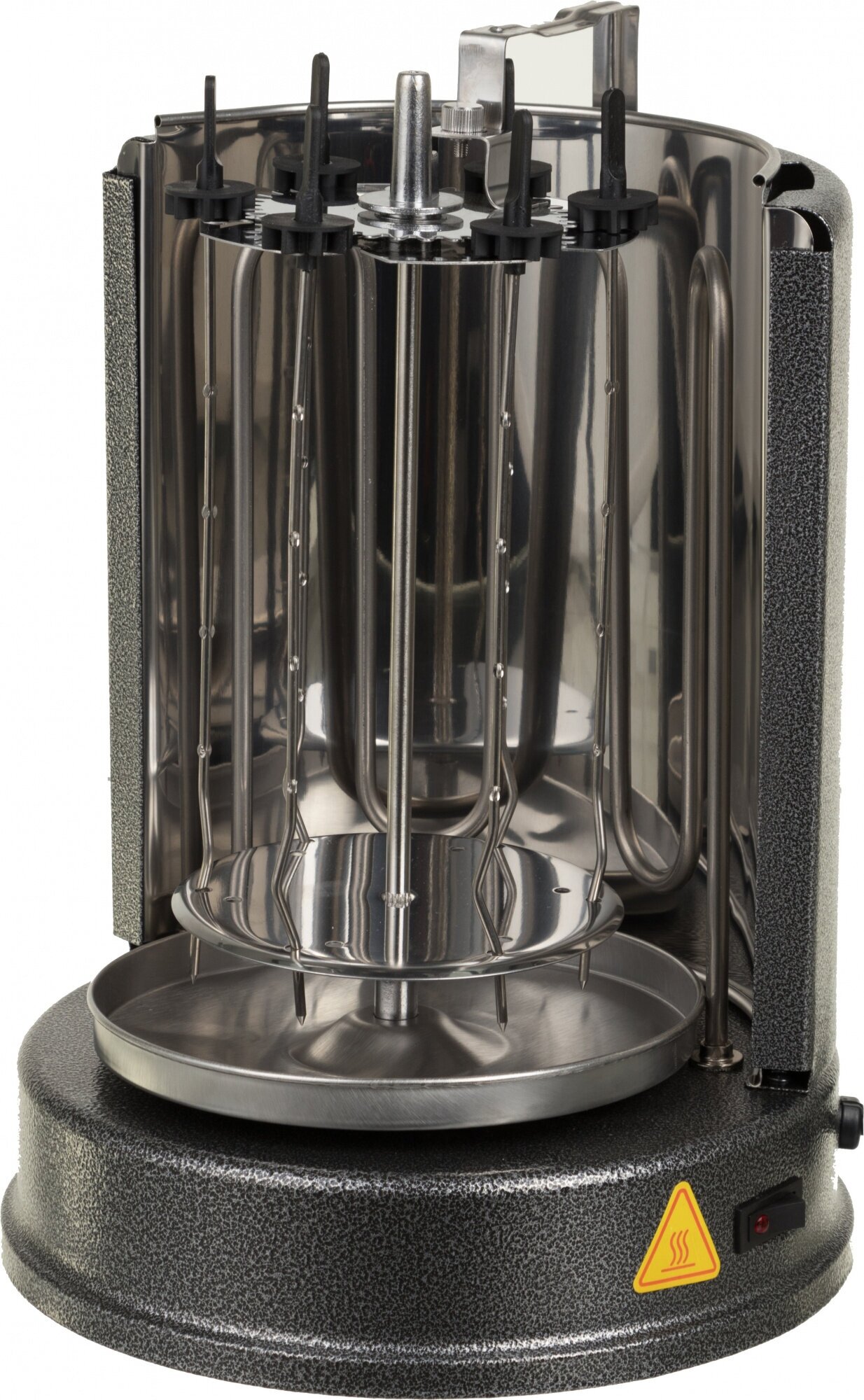 Благодаря вертикальной конструкции электрошашлычница очень компактна и не занимает много места. Под шампурами расположена специальная тарелочка, куда стекает жир. После приготовления эту тарелочку можно снять и легко вымыть, слив жир. Шампуры оснащены удобными ручками из ненагревающегося материала, поэтому их можно брать руками, не обжигаясь.