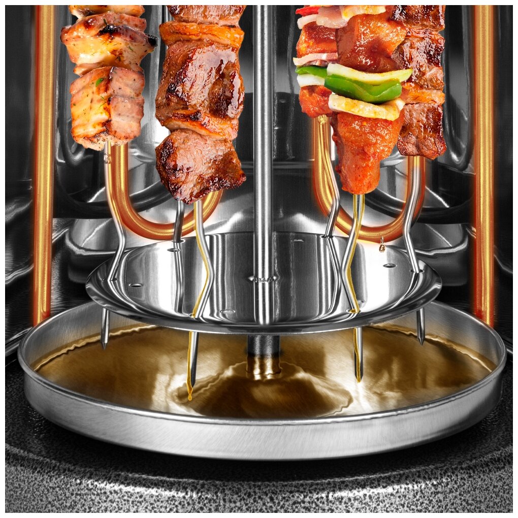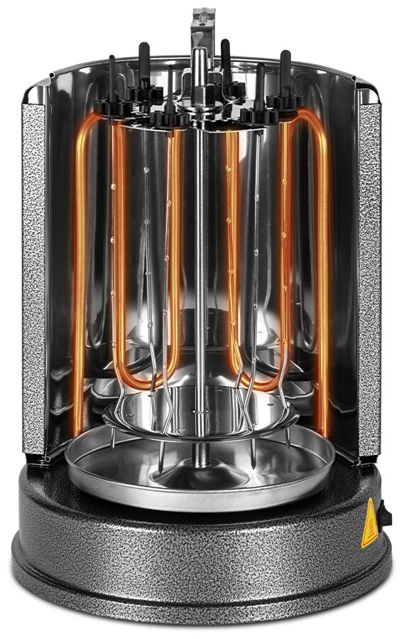 Инфракрасный нагревательный элемент обеспечивает такой же нагрев, какой дают угли в обычном мангале, а шампуры автоматически вращаются, поэтому во время приготовления происходит чередование процесса нагрева и охлаждения, тем самым образуется изумительный вкус и мясо равномерно обжаривается со всех сторон. Поэтому вкус шашлыка в электрической шашлычнице получается даже лучше, чем при традиционном приготовлении.
