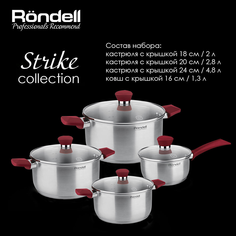 Набор кастрюль Rondell коллекции Strike отлично подойдет для приготовления низкокалорийных блюд без добавления масла или жира на любых типах поверхностей плит, включая индукционные панели. Посуда изготовлена из высококачественной нержавеющей стали, что обеспечивает длительный срок эксплуатации. Одна из главных ее особенностей - тройное вштампованное, а затем вплавленное дно, позволяющее сохранять на некоторое время температуру посуды даже после снятия с источника тепла. Количество предметов составляет 8 шт.
