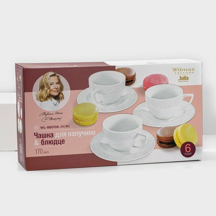 Willmax Набор для капучино Julia Vysotskaya (блюдце+чашка 170 мл) 6 шт. Кофейная пара состоит из 6 кофейных чашек 170мл и 6 блюдец круглой формы. Подарочная упаковка. Высококачественный фарфор покрытый двойным слоем глазировки. Белый с оттенком слоновой кости цвет, выдерживает температуру 300°C, низкое водопоглощение менее 0,1%, высокая ударопрочность. Подходит для использования в микроволновой печи. Можно мыть в посудомоечной машине.
