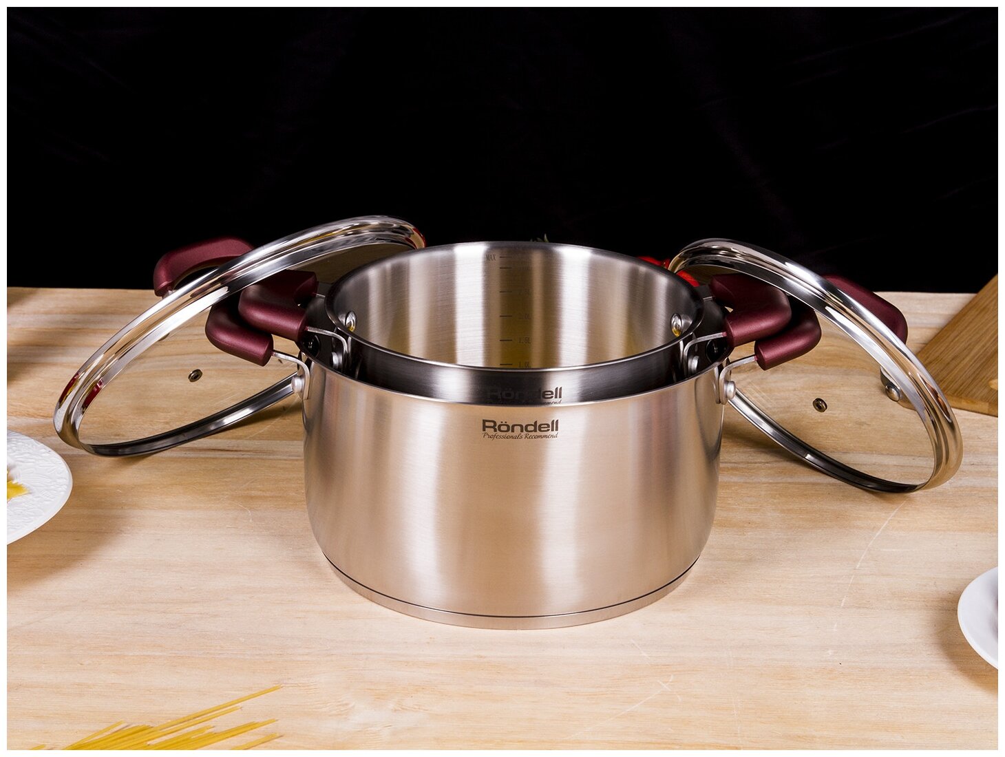 В набор посуды rondell входят две кастрюли ёмкостью 3,3 и 5,6 л. Они обязательно пригодятся всем, кто любит и умеет готовить. Элегантный дизайн благодаря матированному покрытию внешней поверхности и плавному переходу от дна к стенкам кастрюли выглядят особенно элегантно. Прочное дно тройное вштампованное, а затем вплавленное дно, толщина которого составляет 5 мм, обеспечивает равномерный нагрев и долго сохраняет высокую температуру. Такое дно сложно помять или поцарапать.
