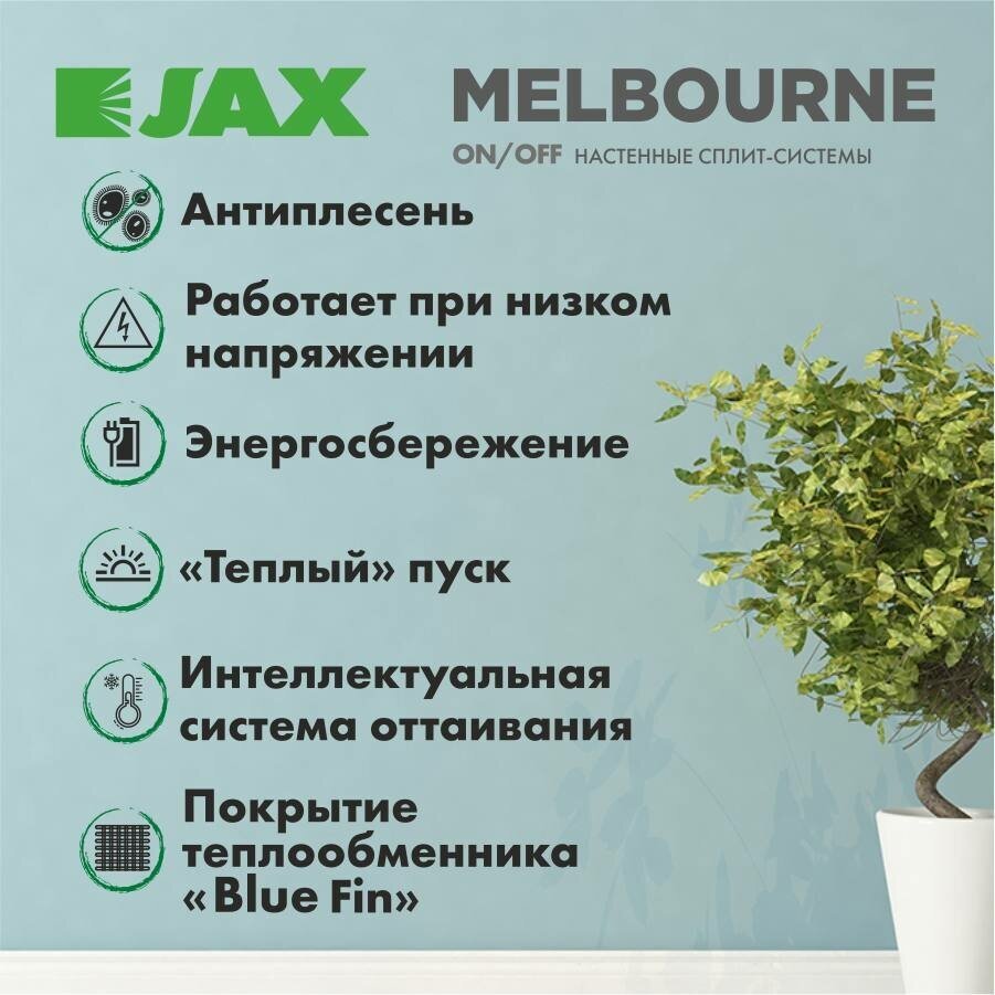 Серия Melbourne On/Off от компании JAX представлена высокопроизводительными бытовыми настенными кондиционерами, которые совмещают в себе компактное исполнение корпуса и высокую производительность работы. Все модели настраиваются с помощью пульта и без труда могут быть запрограммированы на работу в режиме охлаждения, обогрева, вентиляции или очистки воздуха.