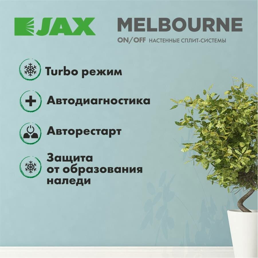 Серия Melbourne On/Off от компании JAX представлена высокопроизводительными бытовыми настенными кондиционерами, которые совмещают в себе компактное исполнение корпуса и высокую производительность работы. Все модели настраиваются с помощью пульта и без труда могут быть запрограммированы на работу в режиме охлаждения, обогрева, вентиляции или очистки воздуха.