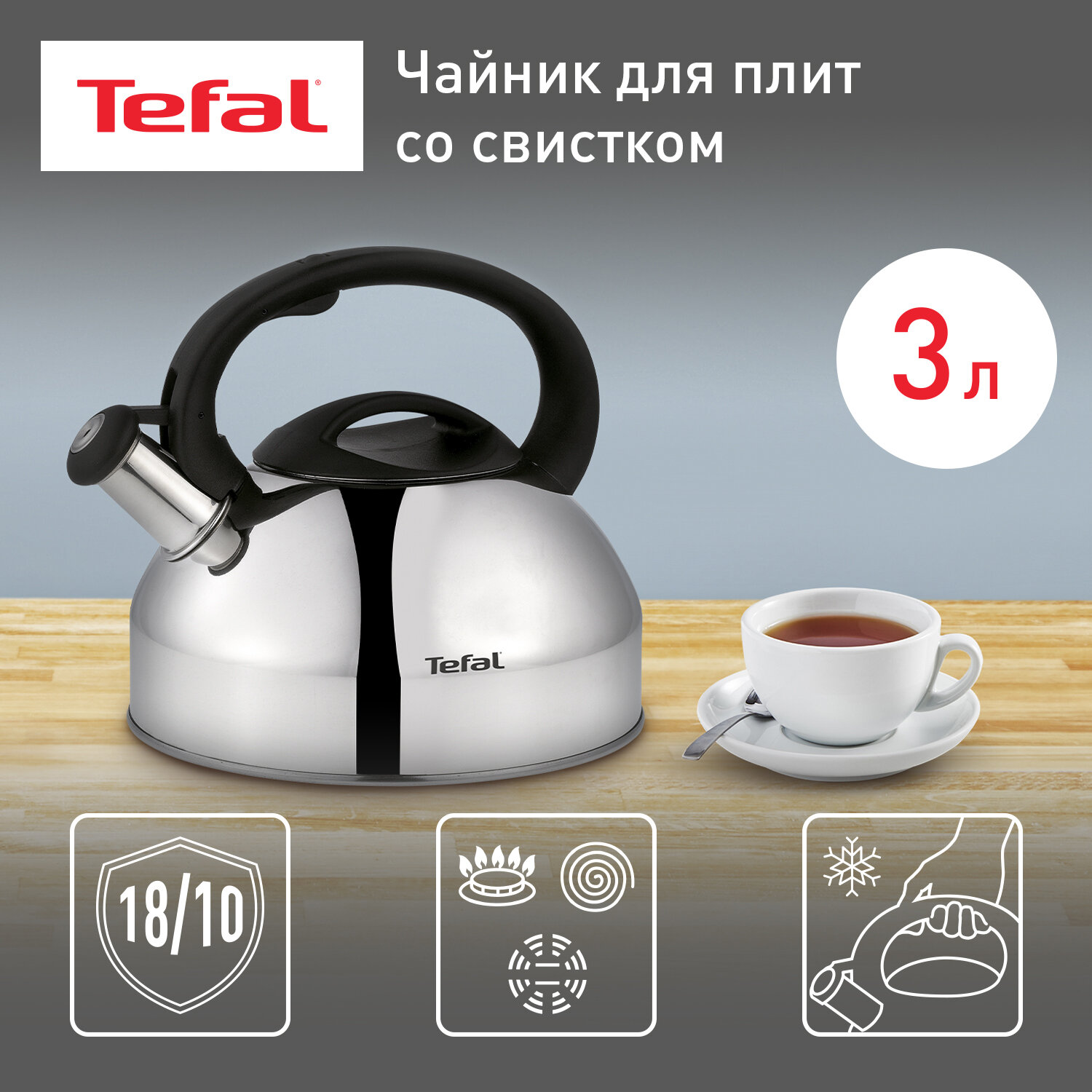 Порадуйте себя и близких вкусным чаем из удобного чайника Tefal. Корпус выполнен из нержавеющей стали, поэтому чайник подходит как для газовых, так и для электрических плит, а эргономичная ручка не перегревается, поэтому вы не рискуете обжечься, когда вода закипит. Уникальная форма чайника и удобная крышка позволяют удобно наливать и сливать воду, а также обеспечивают быстрый и равномерный нагрев и кипячение. В носике чайника расположен свисток, который подаст сигнал, когда вода начнет кипеть – значит, пора заваривать вкусный душистый чай!