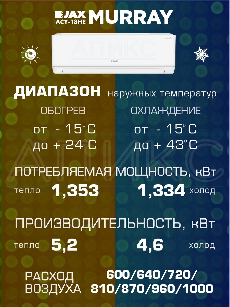 Серия Murray Inverter от бренда JAX представлена настенными кондиционерами, которые способны создавать эффект естественной циркуляции воздуха. Все модели работают в режимах охлаждения и обогрева, поэтому подходят для круглогодичного использования. Устройства обличены в стильные корпуса, которые устойчивы к коррозии и легко поддаются очистке.