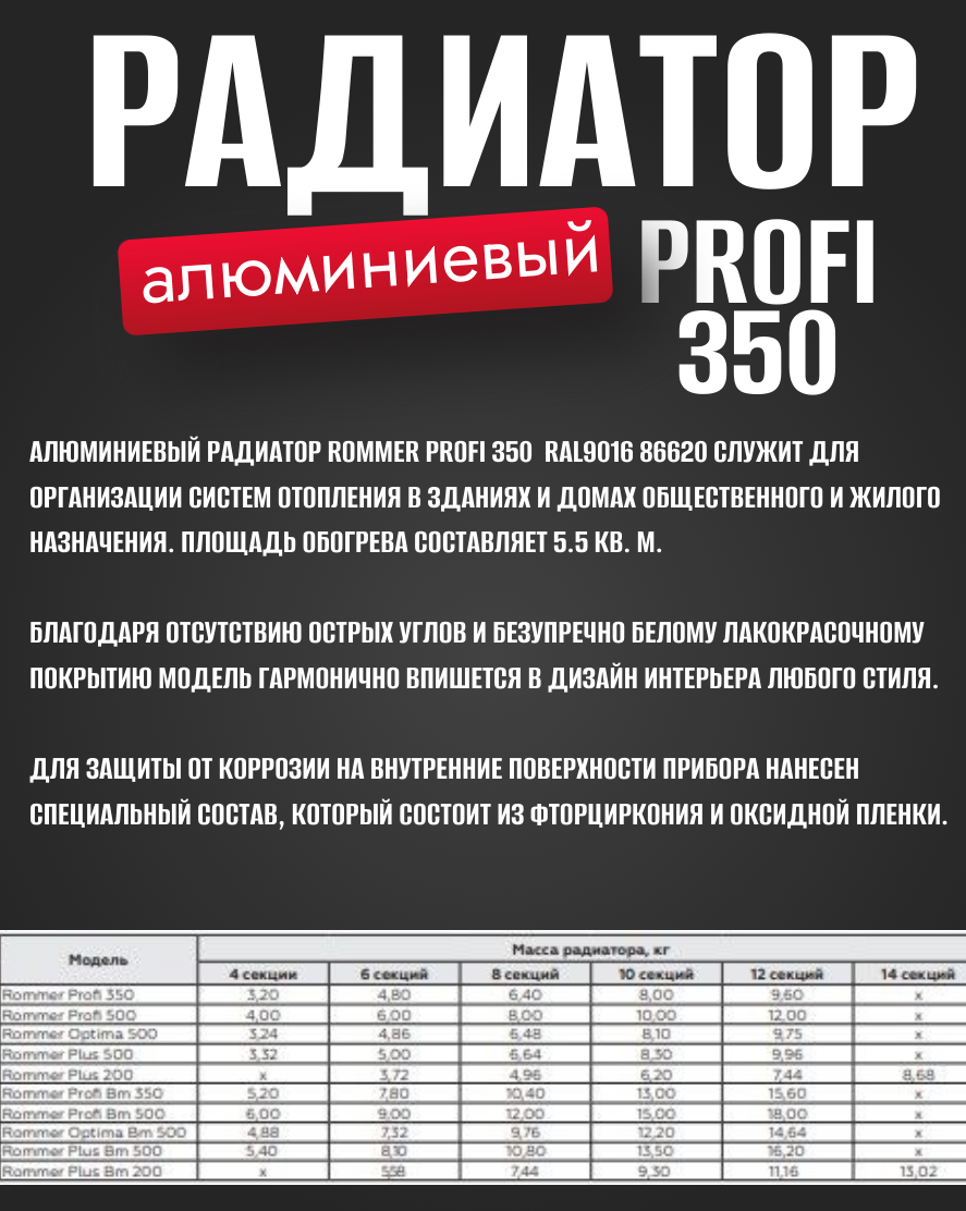 Радиатор алюминиевый Rommer (Роммер) Profi 350 6 секций имеет существенные преимущества, позволяющие ему эффективно обогревать помещение и обеспечивают длительное время эксплуатации без потери качества. Покраска так же отвечает требованиям качества и производится в два этапа. Все поверхности секций так же проверятся на отсутствие повреждений.