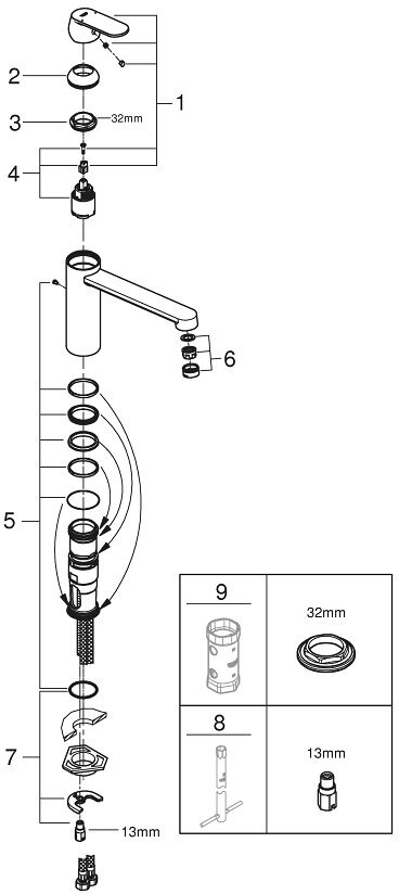 Средний излив. Монтаж на одно отверстие. Grohe starlight поверхность. Grohe silkmove керамический картридж 35 мм. Аэратор. Регулировка расхода воды. Поворотный трубкообразный излив. Область поворота 140°. Гибкая подводка. Система быстрого монтажа. Минимальное давление 1,0 бар.