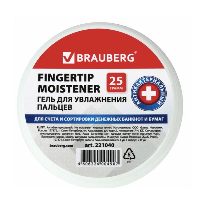 | Прочие особенности и свойства | Гель для увлажнения пальцев BRAUBERG облегчает работу при подсчете денег, перелистывании документов, бюллетеней, подписных листов и др. |