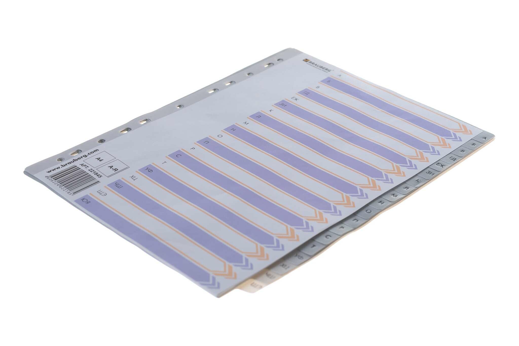 На сегодняшний день товар «Разделитель пластиковый BRAUBERG для папок А4 алфавитный А-Я с оглавлением серый Китай 221845» можно купить с кешбеком в 1 магазине: Яндекс.Маркет