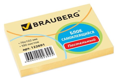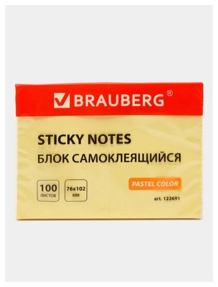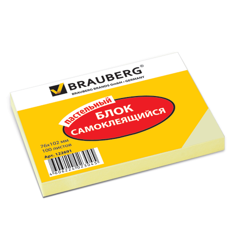 Блок самоклеящийся BRAUBERG 100 листов 76х102мм желтый (122691)