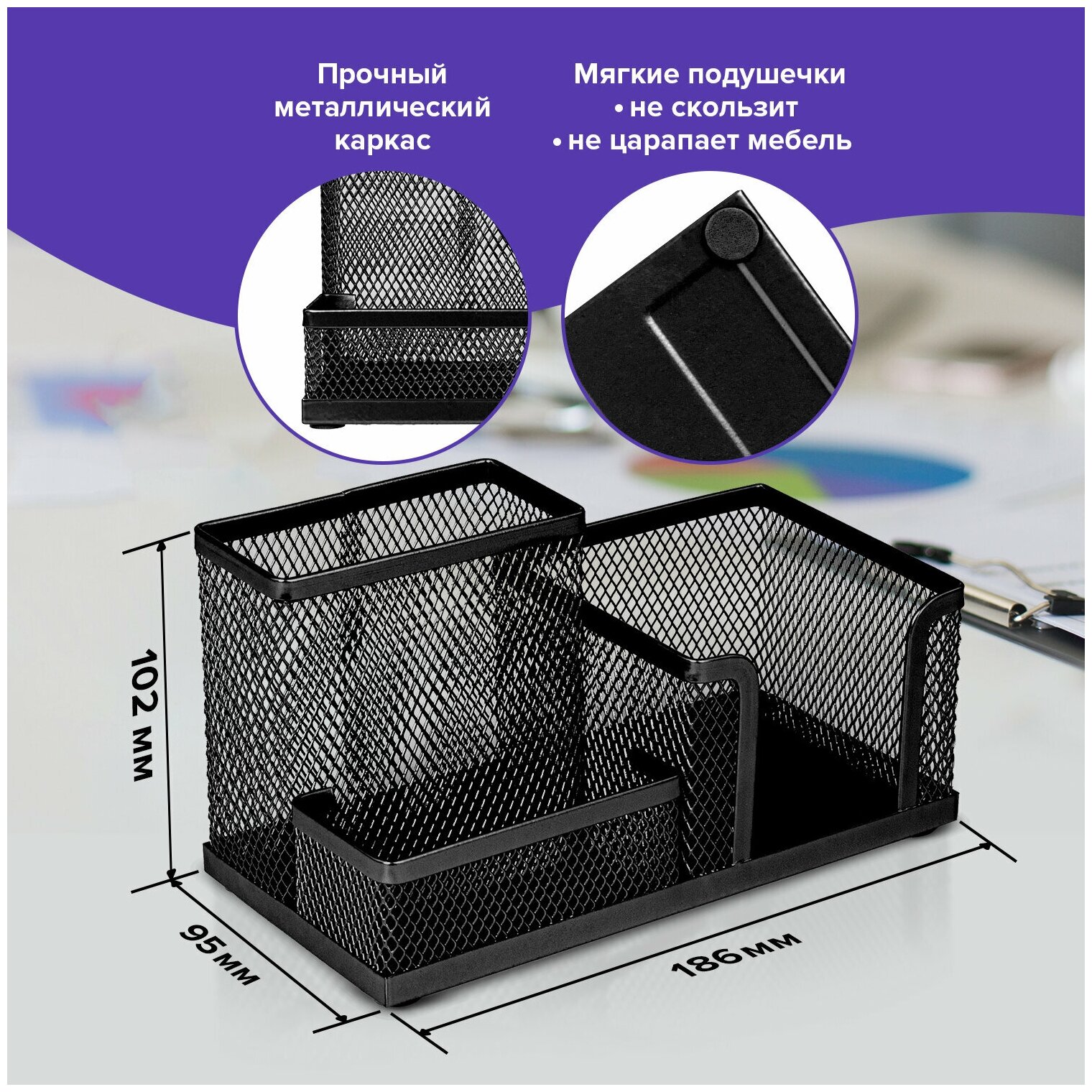 Практичная металлическая подставка-органайзер BRAUBERG Germanium для хранения различных канцелярских принадлежностей.Изготовлена из металлической сетки. И имеет размеры 102х186х95 мм. Состоит из 3-х отделений: одного для бумажного блока размером 90х90 мм и двух - для пишущих принадлежностей и канцелярских мелочей. Мягкие подушечки на дне предотвращают скольжение и не царапают мебель. Подставка-органайзер упакована в фирменную коробку. Поставляется без канцелярского наполнения. Подставка-органайзер BRAUBERG t;Germaniumt; поможет организовать пространство на вашем рабочем столе. Приобрести можно в нашем интернет-магазине.