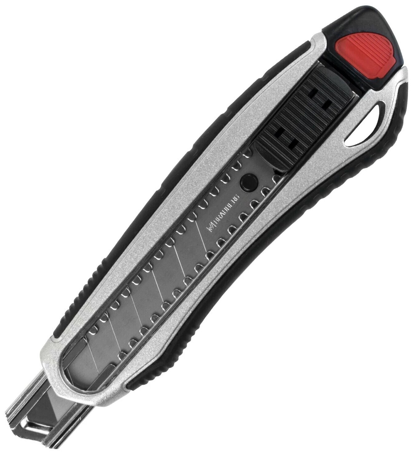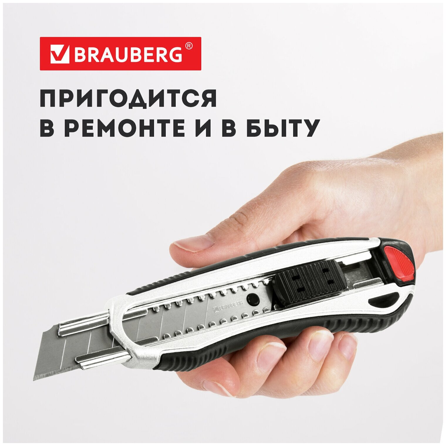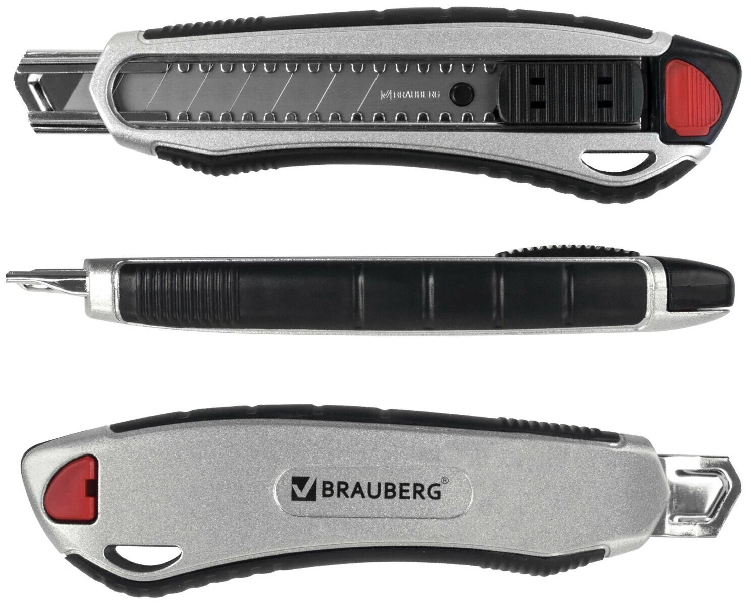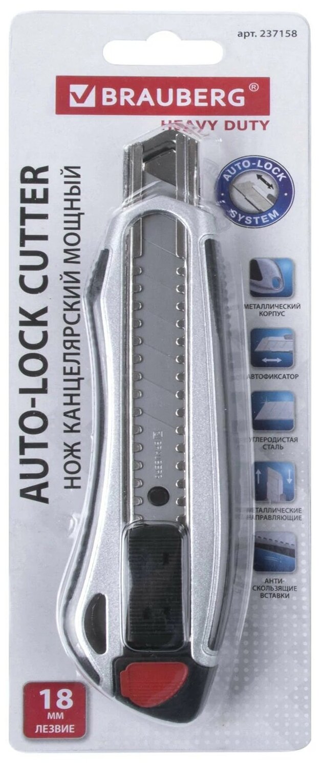 Канцелярский мощный нож BRAUBERG «» – незаменимый инструмент для разрезания бумажных или картонных листов, линолеума, кожи и других плоских поверхностей. Оставляет ровный, без зазубрин разрез, что особенно важно при соблюдении точности резки.