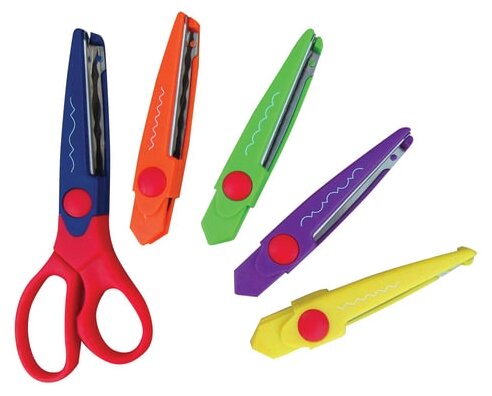 Фигурные ножницы с различными узорами в дисплее — незаменимые помощники в работе с бумагой и картоном. Яркий пластиковый корпус и металлические лезвия из нержавеющей стали с закругленными концами делают ножницы подходящими для детского использования.