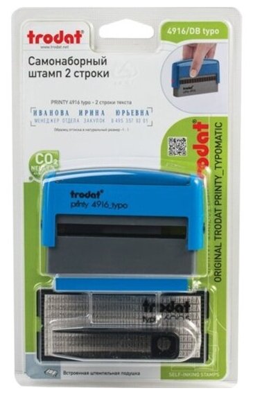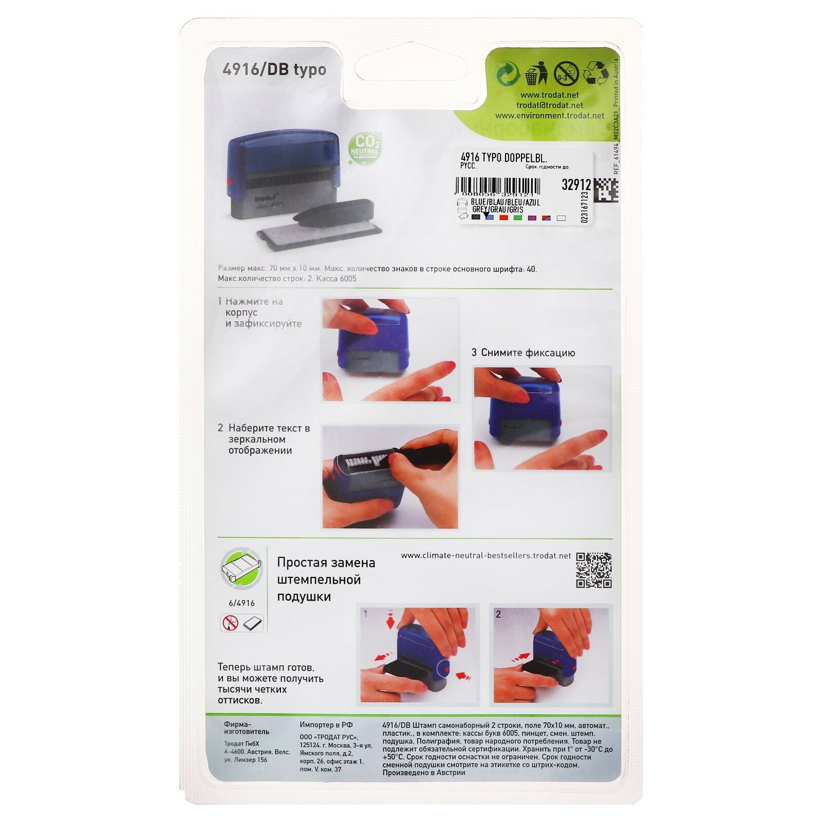 Штамп самонаборный 2-строчный оттиск 70х10 мм синий без рамки TRODAT 4916DB (Австрия) корпус синий касса в комплекте 32912