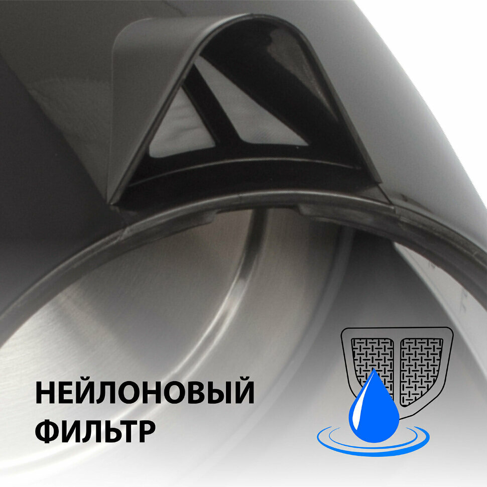 | Прочие особенности и свойства | Стильный и эргономичный дизайн, термостойкий пластик с декоративными вставками. Вода закипает за считанные минуты благодаря большой мощности. Данная модель отлично подходит для эксплуатации как дома, так и в офисе. Вращение на 360 градусов Фильтр от накипи Длина шнура:0.75 м |