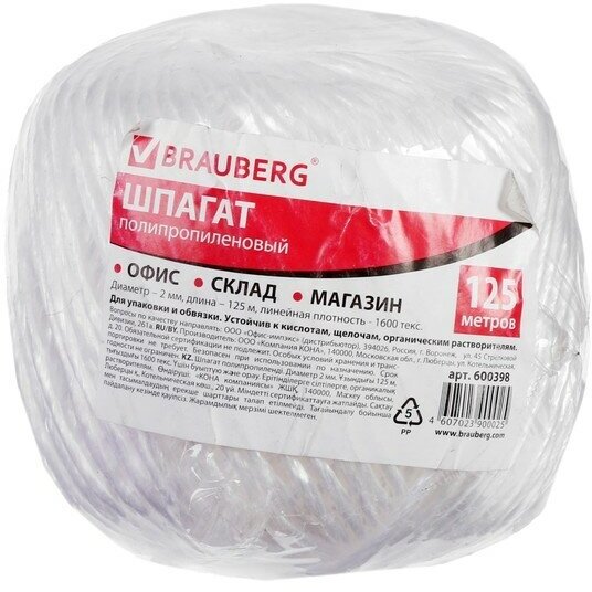 Шпагат полипропиленовый BRAUBERG длина 125 м диаметр 2 мм линейная плотность 1600 текс 600398