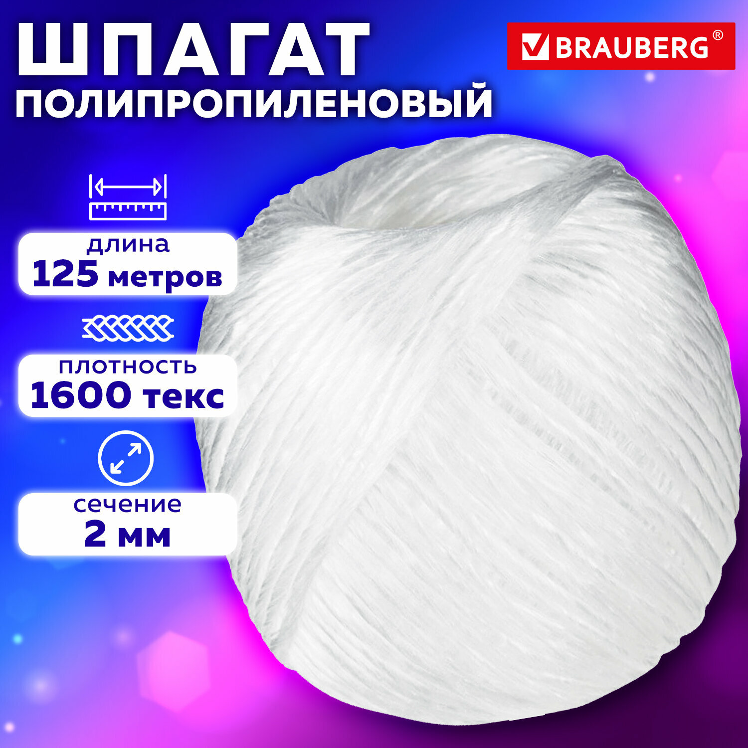На сегодняшний день товар «Шпагат полипропиленовый BRAUBERG длина 125 м диаметр 2 мм линейная плотность 1600 текс 600398» можно купить с кешбеком в 1 магазине: Яндекс.Маркет