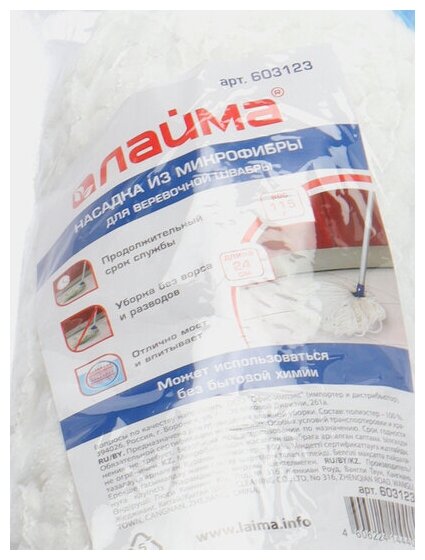 Веревочная насадка предназначена для проведения влажной уборки в помещениях с небольшой площадью. Микрофибра обладает отличными моющими и впитывающими свойствами, может использоваться без применения средств бытовой химии.