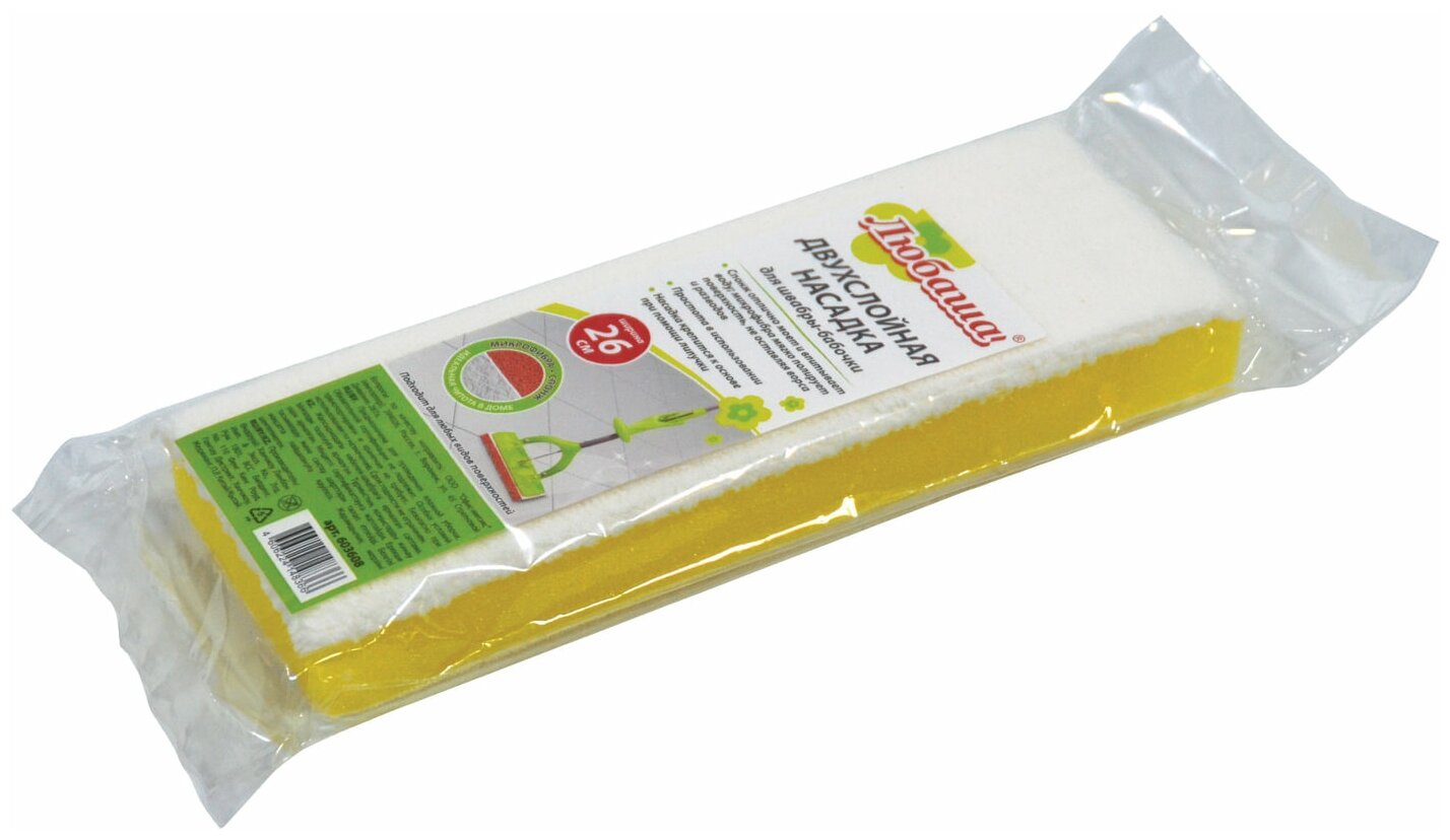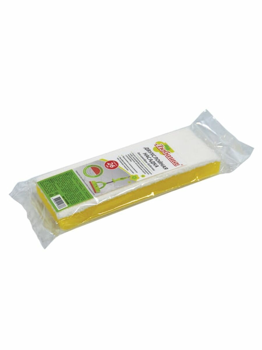Двухслойная насадка ТМ ЛЮБАША предназначена для проведения влажной уборки. Используется в комплекте со шваброй, к которой она крепится с помощью липучки. Верхний слой - спонж - отлично моет, нижний - микрофибра - мягко полирует.