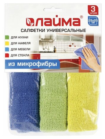 Салфетки универсальные КОМПЛЕКТ 3 шт. микрофибра 25х25 см ассорти (синяя зеленая желтая) ЛАЙМА 601243