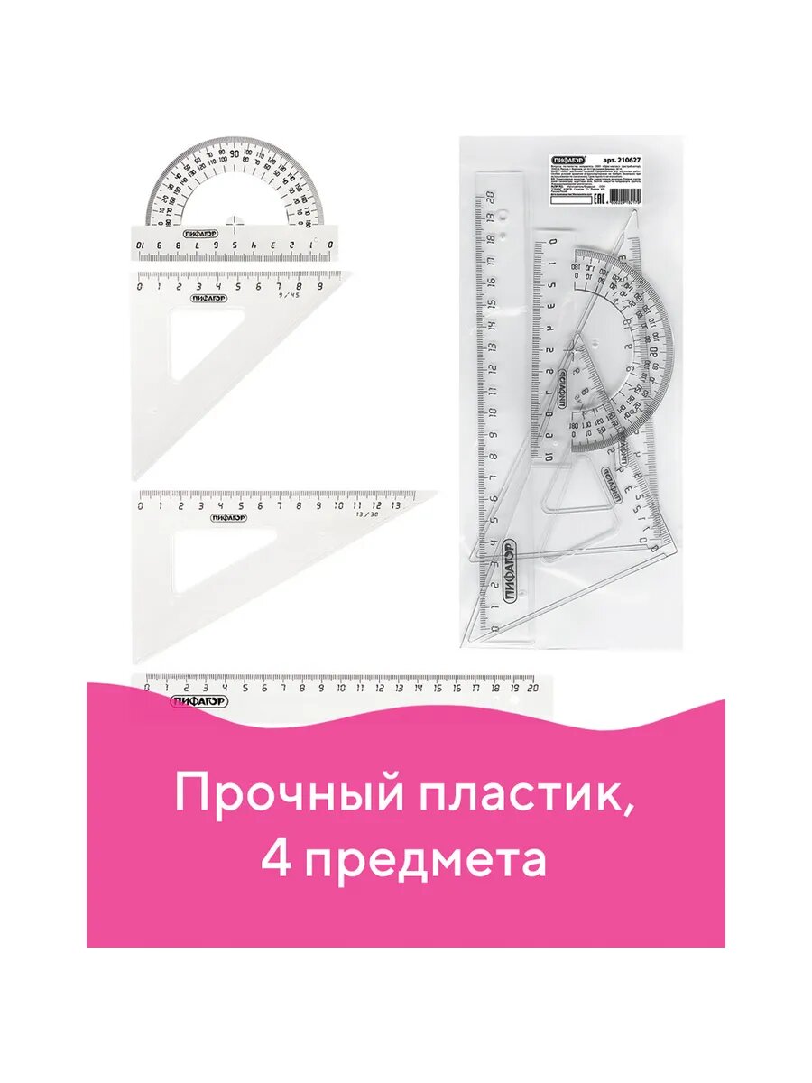 | Дополнительно | Геометрический набор для чертежных работ из прочного пластика.,,Состав набора:,,1. Линейка со шкалой 20 см;,,2. Угольник с углом 45° и шкалой 9 см;,,3. Угольник с углом 30° и шкалой 13 см;,,4. Транспортир 180° с линейкой 10 см.,,Характеристики,Количество предметов в наборе:4,Максимальная длина разметки |