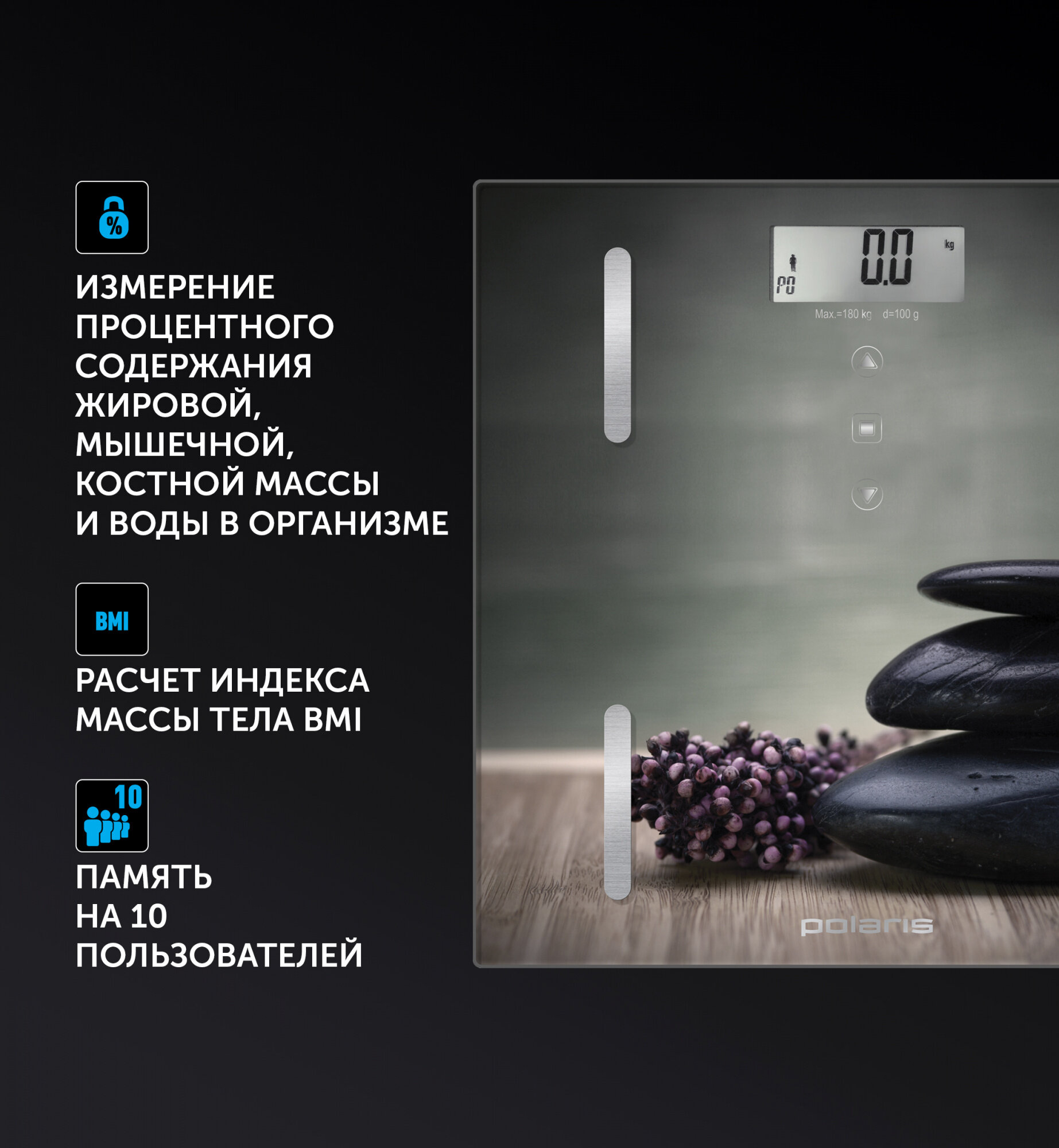 | Прочие особенности и свойства | Расчет ИМТ (BMI) Да Ввод данных о человеке Да Измерение по четырем датчикам Да Определение доли воды Да Определение доли жировой ткани Определение доли костной ткани Определение доли мышечной ткани |